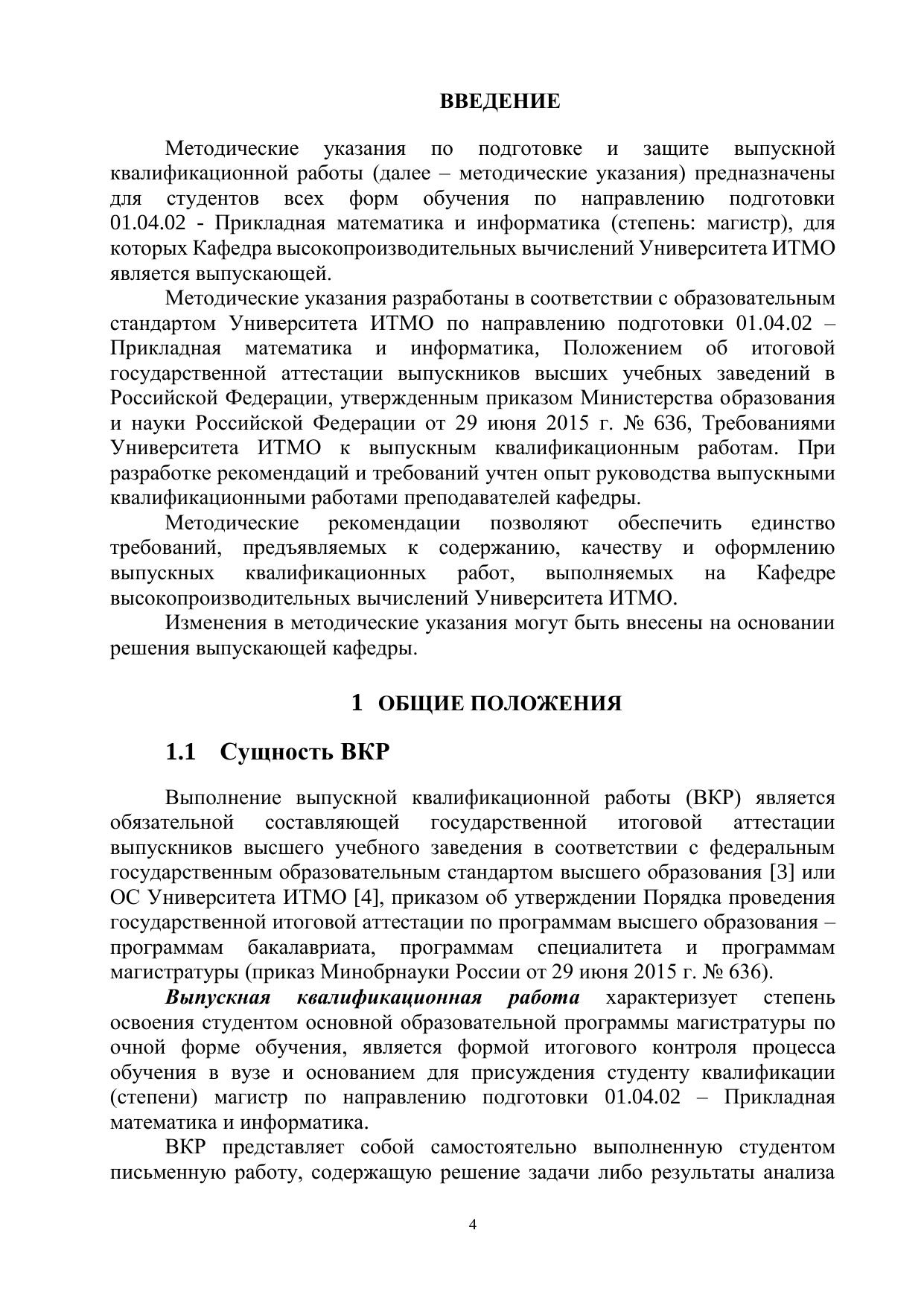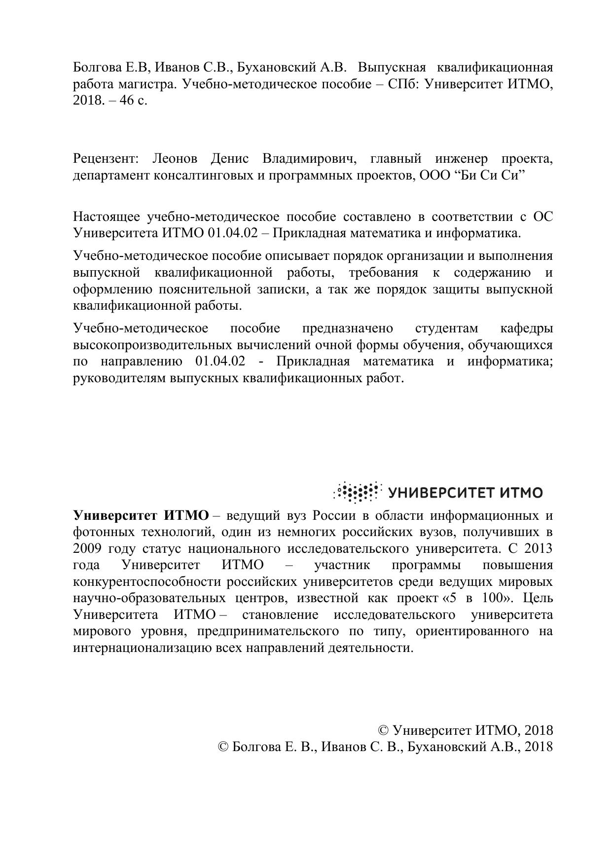 Учебно-методическое пособие описывает порядок организации и выполнения выпускной квалификационной работы, требования к содержанию и оформлению пояснительной записки, а так же порядок защиты выпускной квалификационной работы. Учебно-методическое пособие предназначено студентам кафедры высокопроизводительных вычислений очной формы обучения, обучающихся по направлению 01.04.02 - Прикладная математика и информатика; руководителям выпускных квалификационных работ.