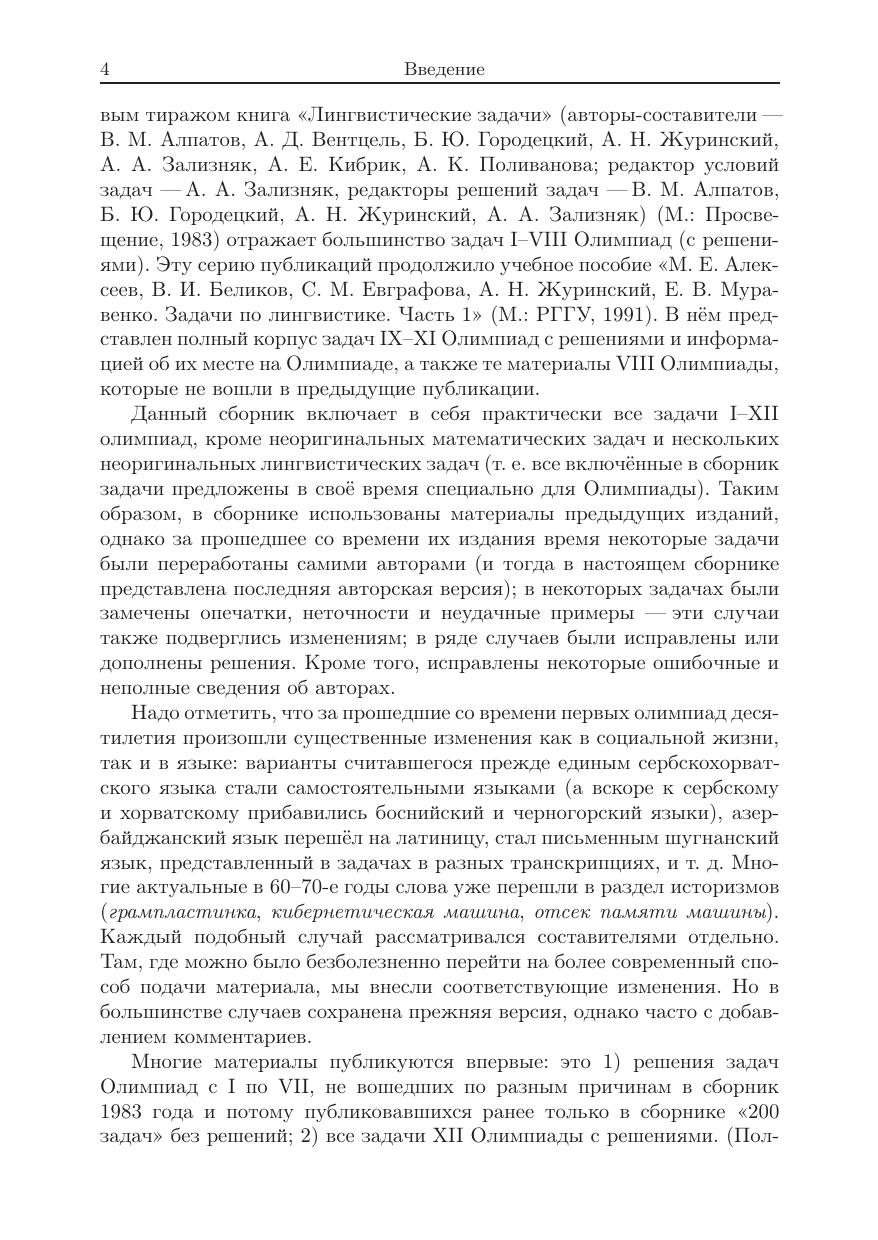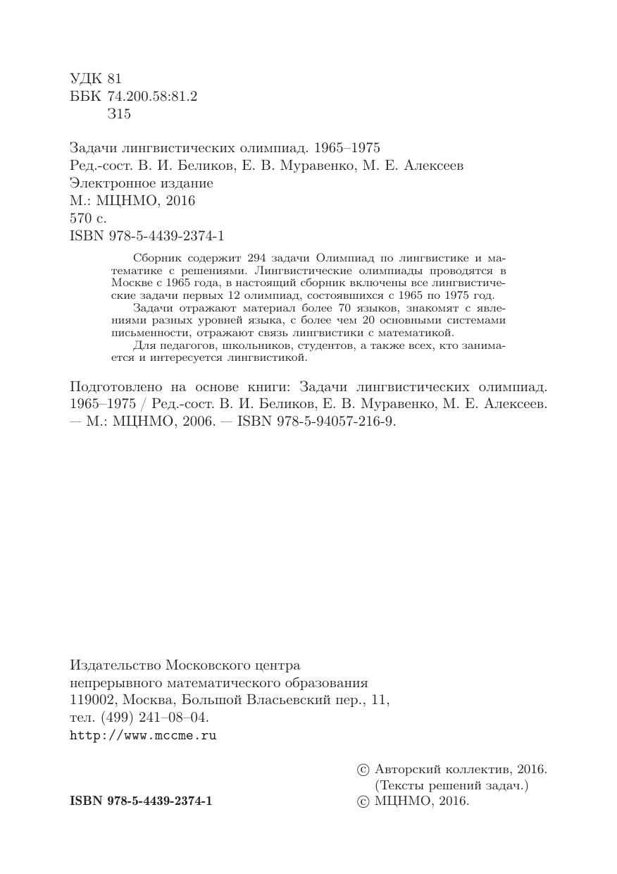 Сборник содержит 294 задачи Олимпиад по лингвистике и математике с решениями. Лингвистические олимпиады проводятся в Москве с 1965 года, в настоящий сборник включены все лингвистические задачи первых 12 олимпиад, состоявшихся с 1965 по 1975 год. Задачи отражают материал более 70 языков, знакомят с явлениями разных уровней языка, с более чем 20 основными системами письменности, отражают связь лингвистики с математикой. Для педагогов, школьников, студентов, а также всех, кто занимается и интересуется лингвистикой.