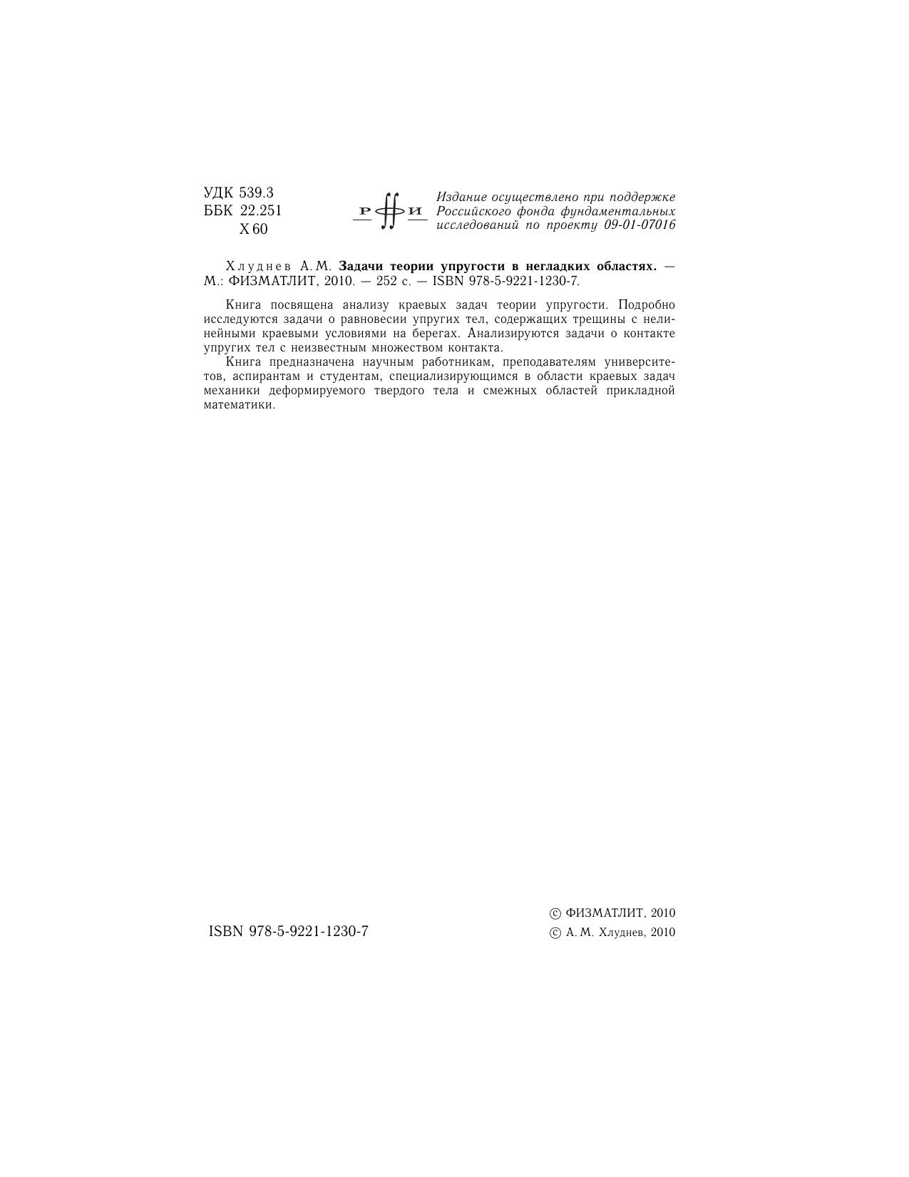 Книга посвящена анализу краевыхзадач теории упругости. Подробно исследуются задачи о равновесии упругихтел, содержащих трещины с нелинейными краевыми условиями на берегах. Анализируются задачи о контакте упругихтел с неизвестным множеством контакта. Книга предназначена научным работникам, преподавателям университетов, аспирантам и студентам, специализирующимся в области краевых задач механики деформируемого твердого тела и смежных областей прикладной математики