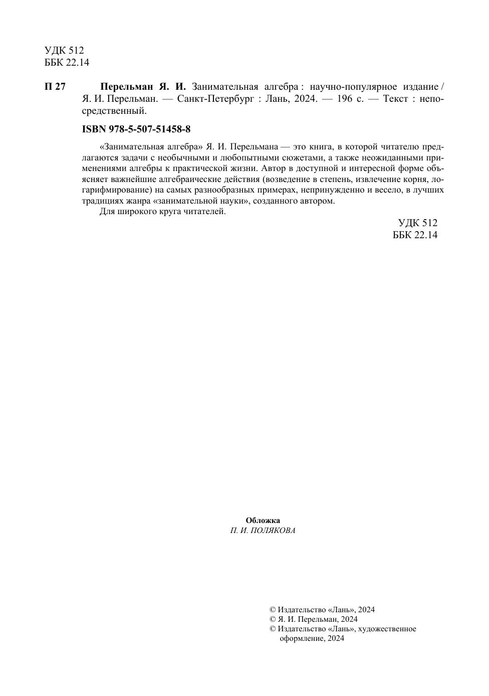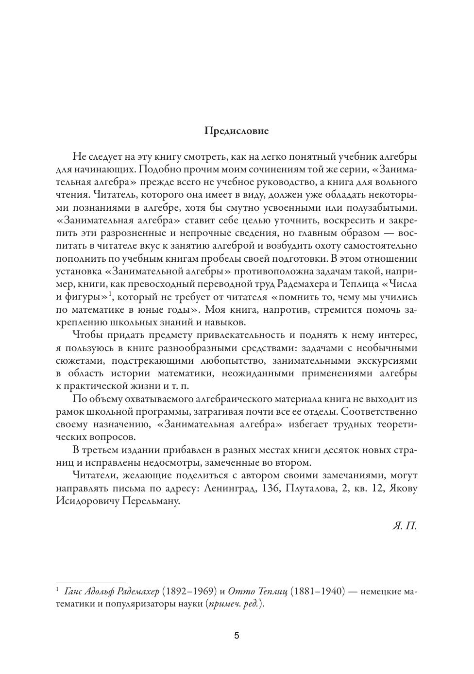 «Занимательная алгебра» Я. И. Перельмана — это книга, в которой читателю предлагаются задачи с необычными и любопытными сюжетами, а также неожиданными применениями алгебры к практической жизни. Автор в доступной и интересной форме объясняет важнейшие алгебраические действия (возведение в степень, извлечение корня, логарифмирование) на самых разнообразных примерах, непринужденно и весело, в лучших традициях жанра «занимательной науки», созданного автором. Для широкого круга читателей.