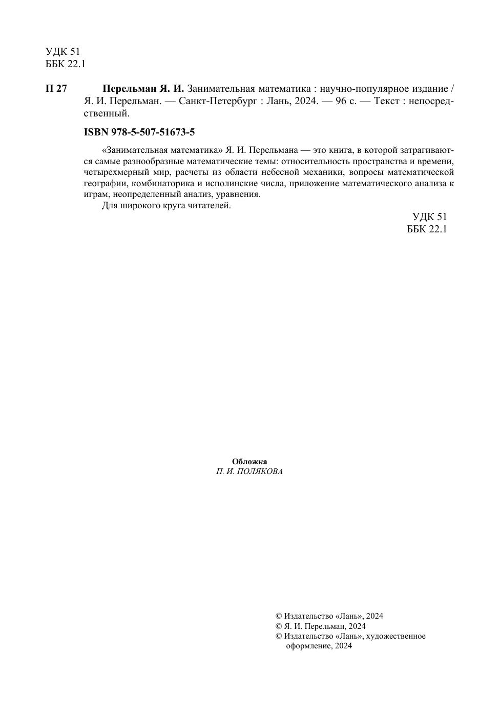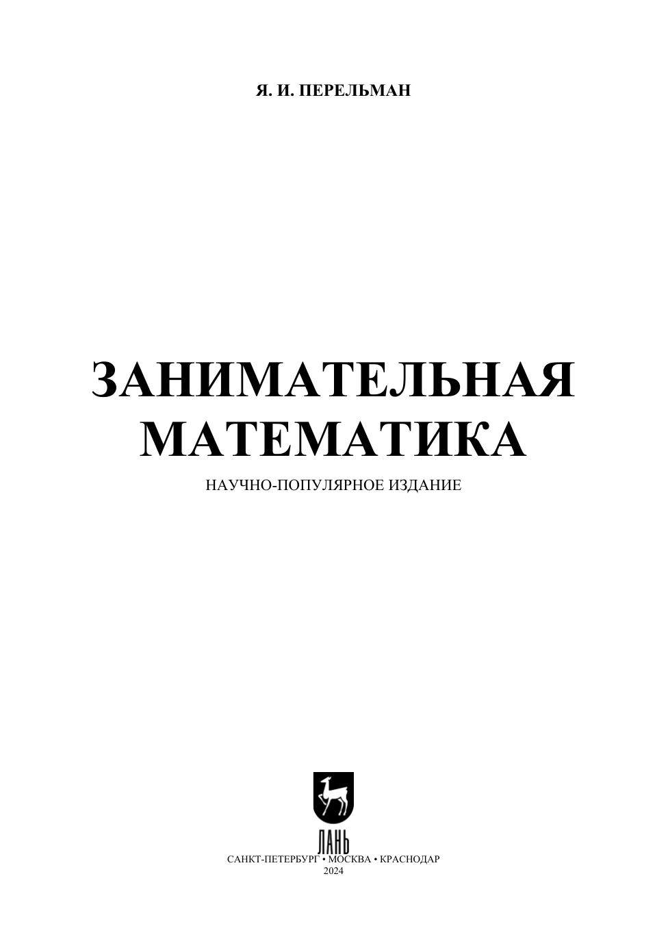 «Занимательная математика» Я. И. Перельмана — это книга, в которой затрагиваются самые разнообразные математические темы: относительность пространства и времени, четырехмерный мир, расчеты из области небесной механики, вопросы математической географии, комбинаторика и исполинские числа, приложение математического анализа к играм, неопределенный анализ, уравнения. Для широкого круга читателей.