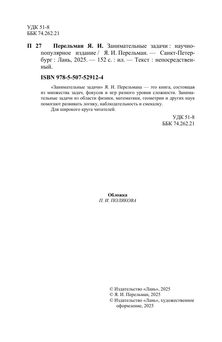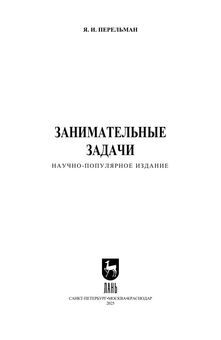«Занимательные задачи» Я. И. Перельмана — это книга, состоящая из множества задач, фокусов и игр разного уровня сложности. Занимательные задачи из области физики, математики, геометрии и других наук помогают развивать логику, наблюдательность и смекалку. Для широкого круга читателей.