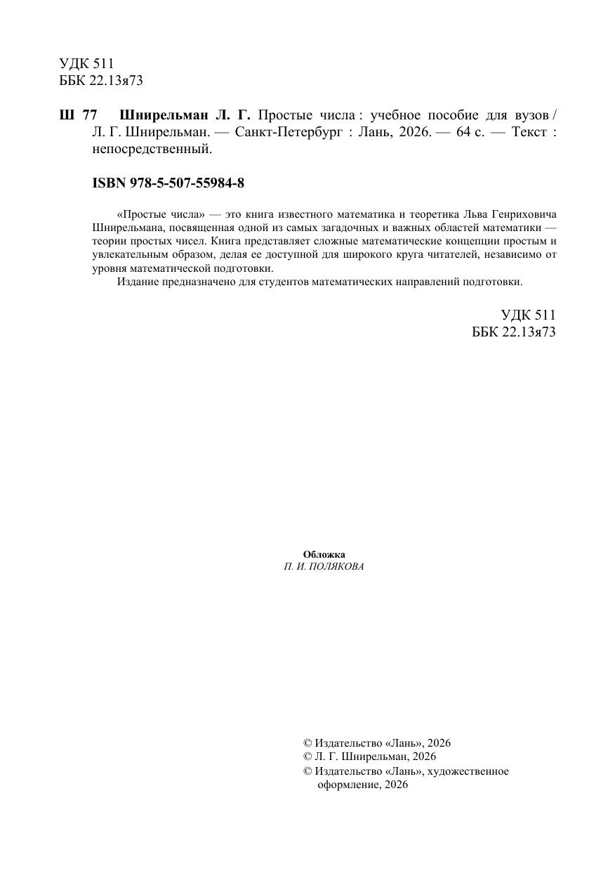 «Простые числа» — это книга известного математика и теоретика Льва Генриховича Шнирельмана, посвященная одной из самых загадочных и важных областей математики — теории простых чисел. Книга представляет сложные математические концепции простым и увлекательным образом, делая ее доступной для широкого круга читателей, независимо от уровня математической подготовки. Издание предназначено для студентов математических направлений подготовки.