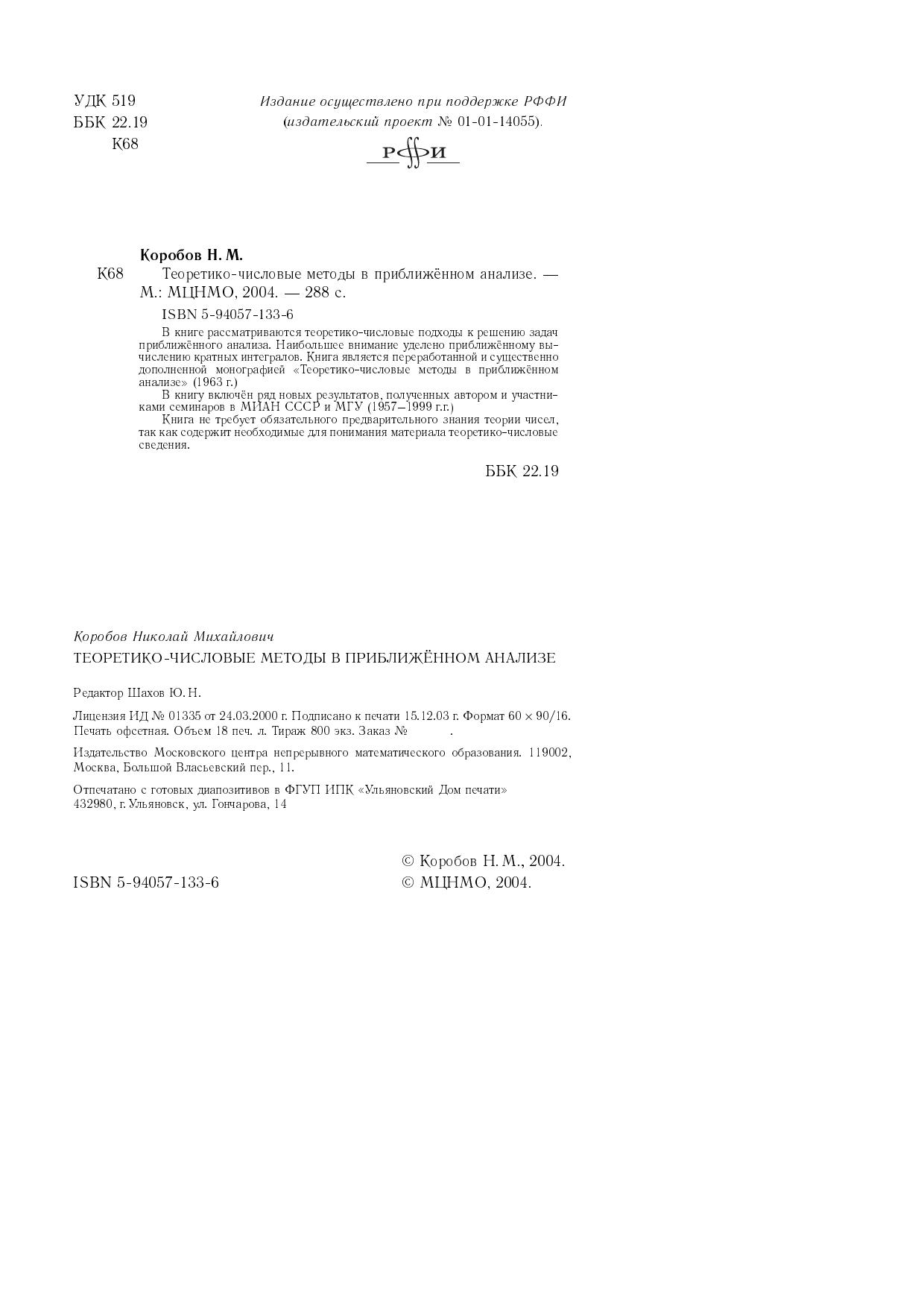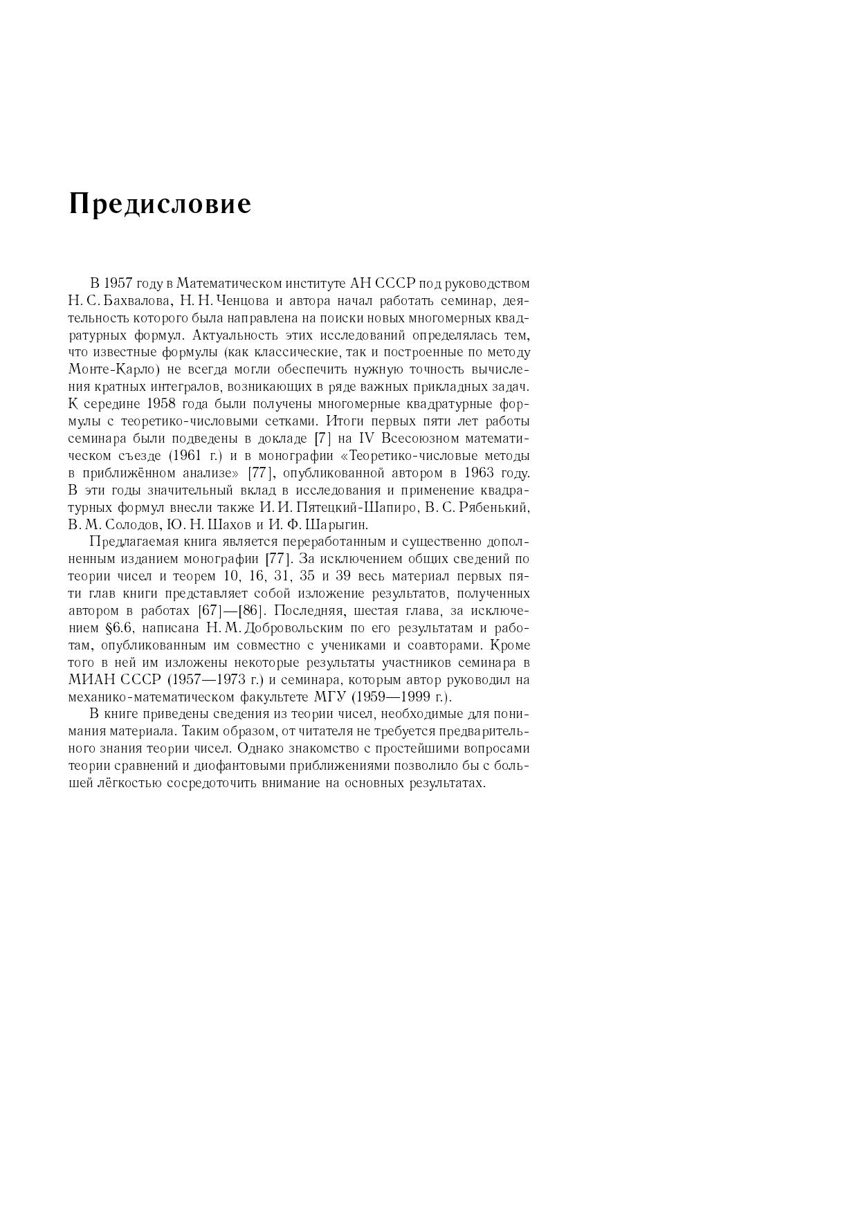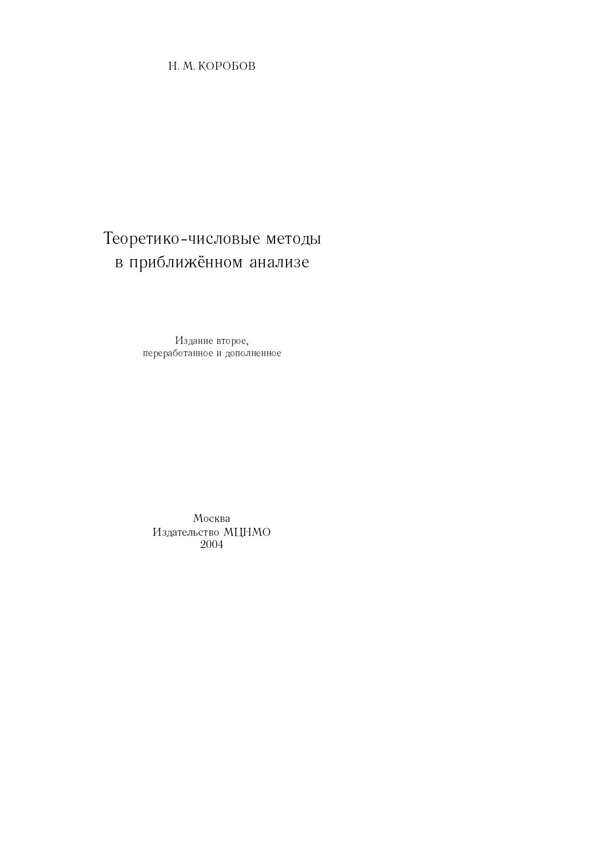 В книге рассматриваются теоретико-числовые подходы к решению задач приближённого анализа. Наибольшее внимание уделено приближённому вычислению кратных интегралов. Книга является переработанной и существенно дополненной монографией "Теоретико-числовые методы в приближённом анализе" (1963 г.)В книгу включён ряд новых результатов, полученных автором и участниками семинаров в МИАН СССР и МГУ (1957–1999 г.г.)Книга не требует обязательного предварительного знания теории чисел, так как содержит необходимые для понимания материала теоретико-числовые сведения.