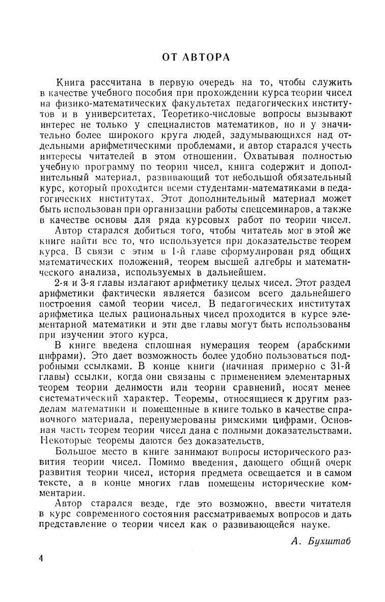 Учебное пособие полностью охватывает программу по теории чисел, а также содержит дополнительный материал, который может быть использован при организации работы спецсеминаров и в качестве основы для курсовых работ по теории чисел. Учебное пособие предназначено для студентов университетов и педагогических вузов.