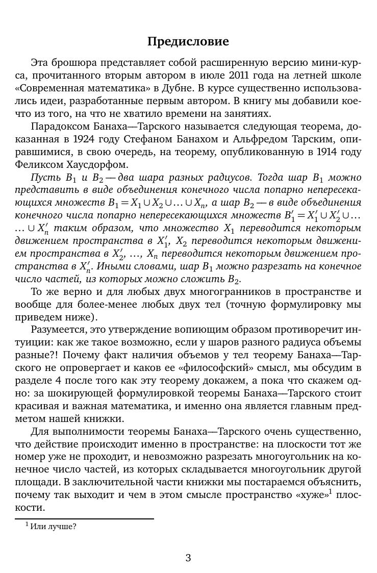 В 1924 году выдающиеся польские математики Стефан Банах и Альфред Тарский доказали, что шар в пространстве можно разрезать на конечное число частей, из которых можно сложить шар другого объема. В брошюре мы расскажем, почему эта теорема, производящая впечатление нелепости, не противоречит возможности измерять объемы тел, и познакомим читателя с красивой математикой, стоящей за этим уже классическим результатом. Для школьников старших классов и студентов младших курсов.
