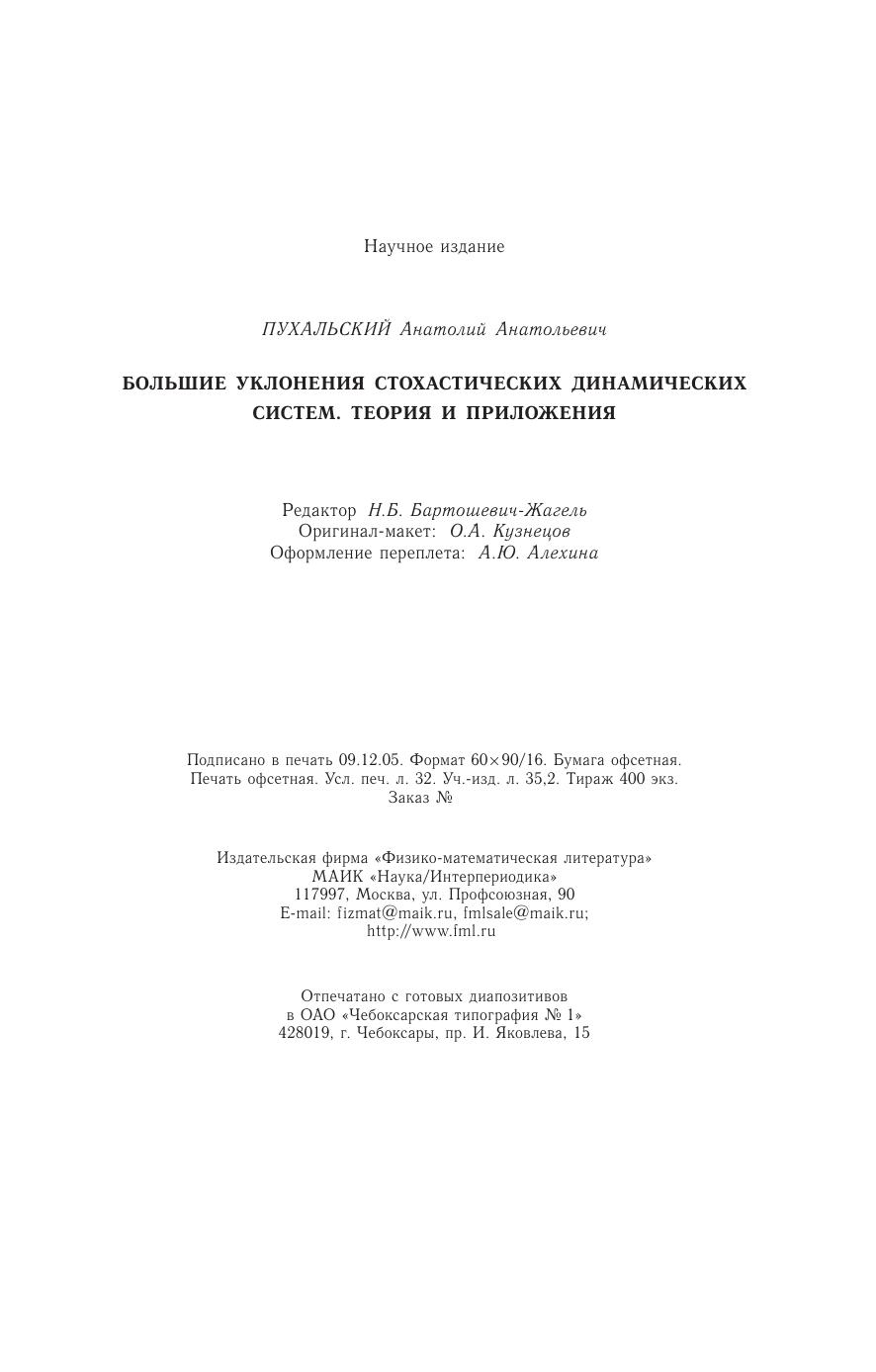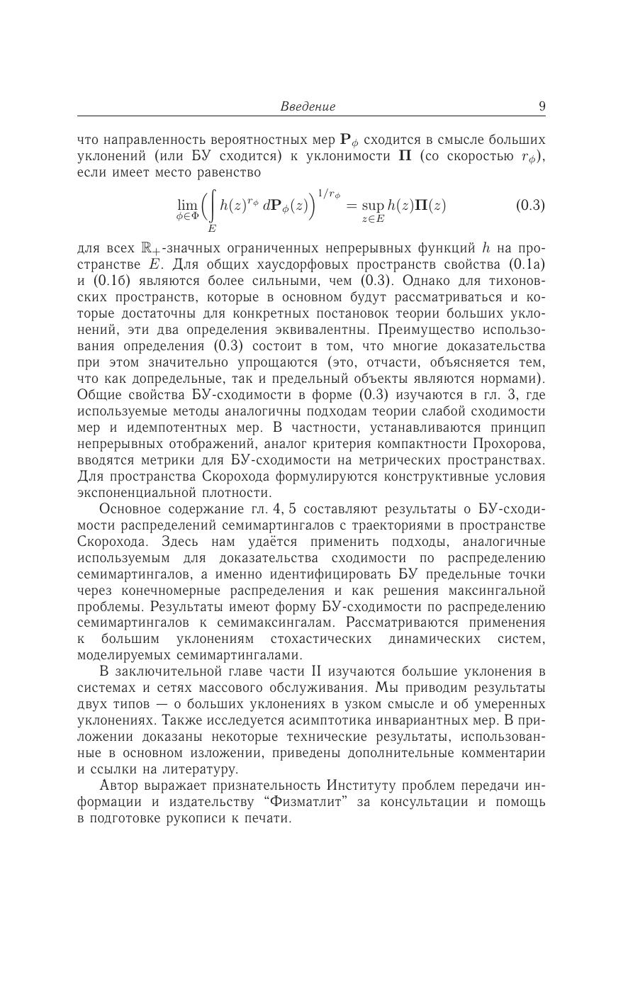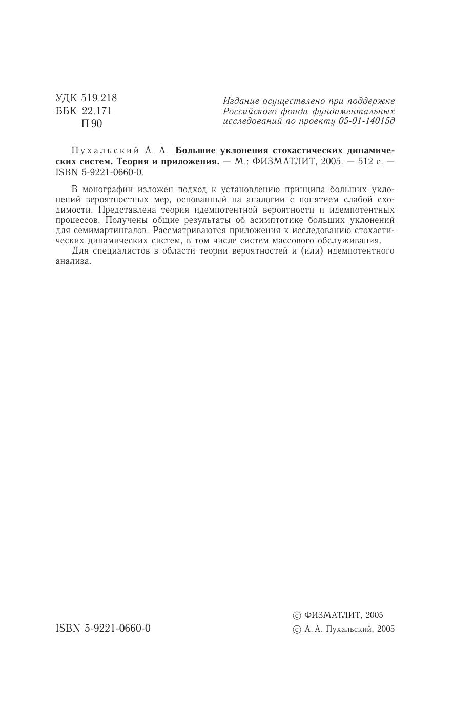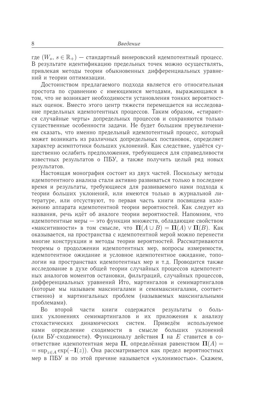 В монографии изложен подход к установлению принципа больших уклонений вероятностных мер, основанный на аналогии с понятием слабой сходимости. Представлена теория идемпотентной вероятности и идемпотентных процессов. Получены общие результаты об асимптотике больших уклонений для семимартингалов. Рассматриваются приложения к исследованию стохастических динамических систем, в том числе систем массового обслуживания. Для специалистов в области теории вероятностей и (или) идемпотентного анализа.