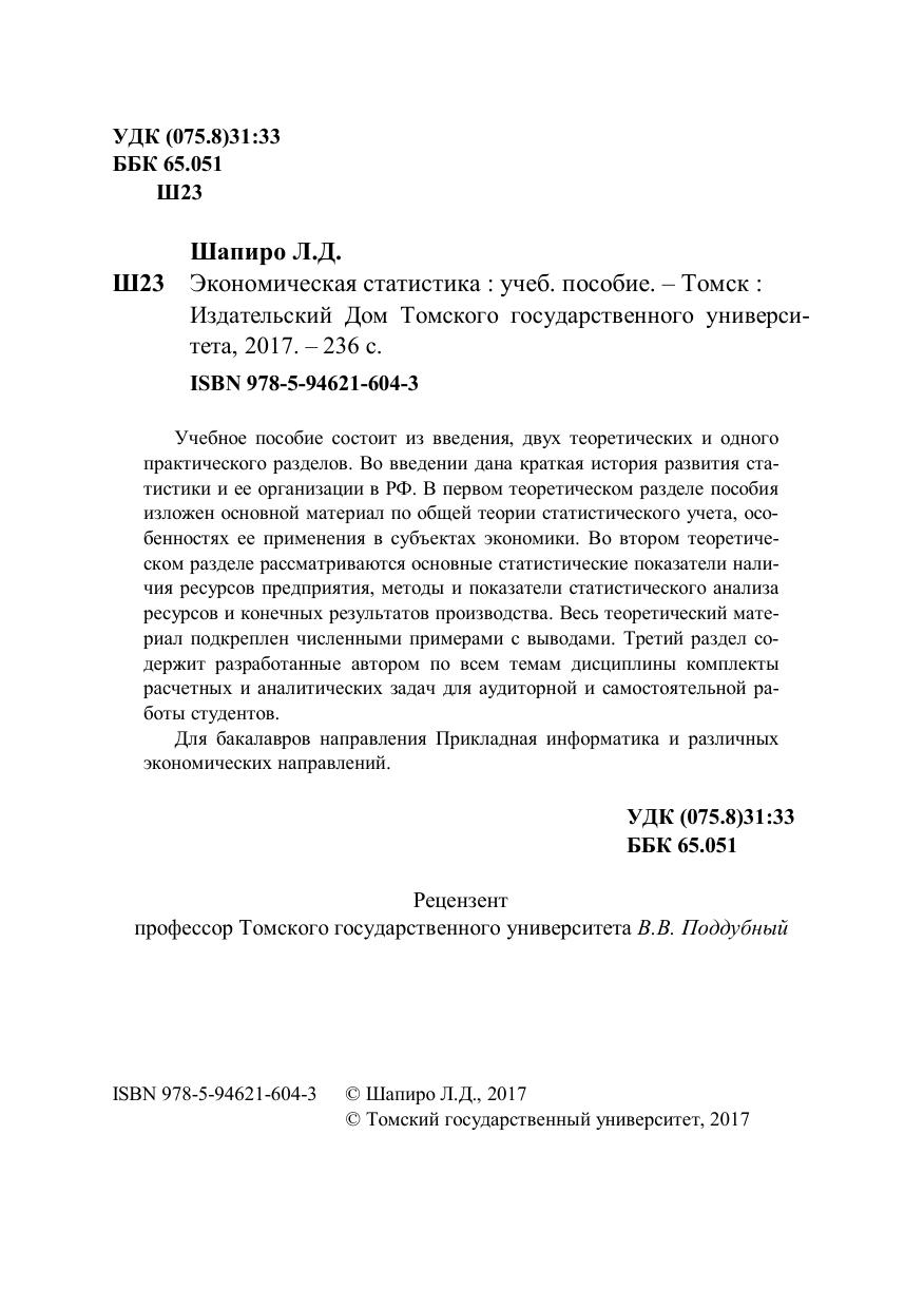 Учебное пособие состоит из введения, двух теоретических и одного практического разделов. Во введении дана краткая история развития статистики и ее организации в РФ. В первом теоретическом разделе пособия изложен основной материал по общей теории статистического учета, особенностях ее применения в субъектах экономики. Во втором теоретическом разделе рассматриваются основные статистические показатели наличия ресурсов предприятия, методы и показатели статистического анализа ресурсов и конечных результатов производства. Весь теоретический материал подкреплен численными примерами с выводами. Третий раздел содержит разработанные автором по всем темам дисциплины комплекты расчетных и аналитических задач для аудиторной и самостоятельной работы студентов. Для бакалавров направления Прикладная информатика и различных экономических направлений.