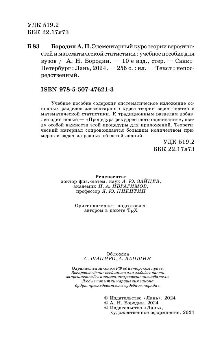 Учебное пособие содержит систематическое изложение основных разделов элементарного курса теории вероятностей и математической статистики. К традиционным разделам добавлен один новый — "Процедура рекуррентного оценивания", ввиду особой важности этой процедуры для приложений. Теоретический материал сопровождается большим количеством примеров и задач из разных областей знаний.