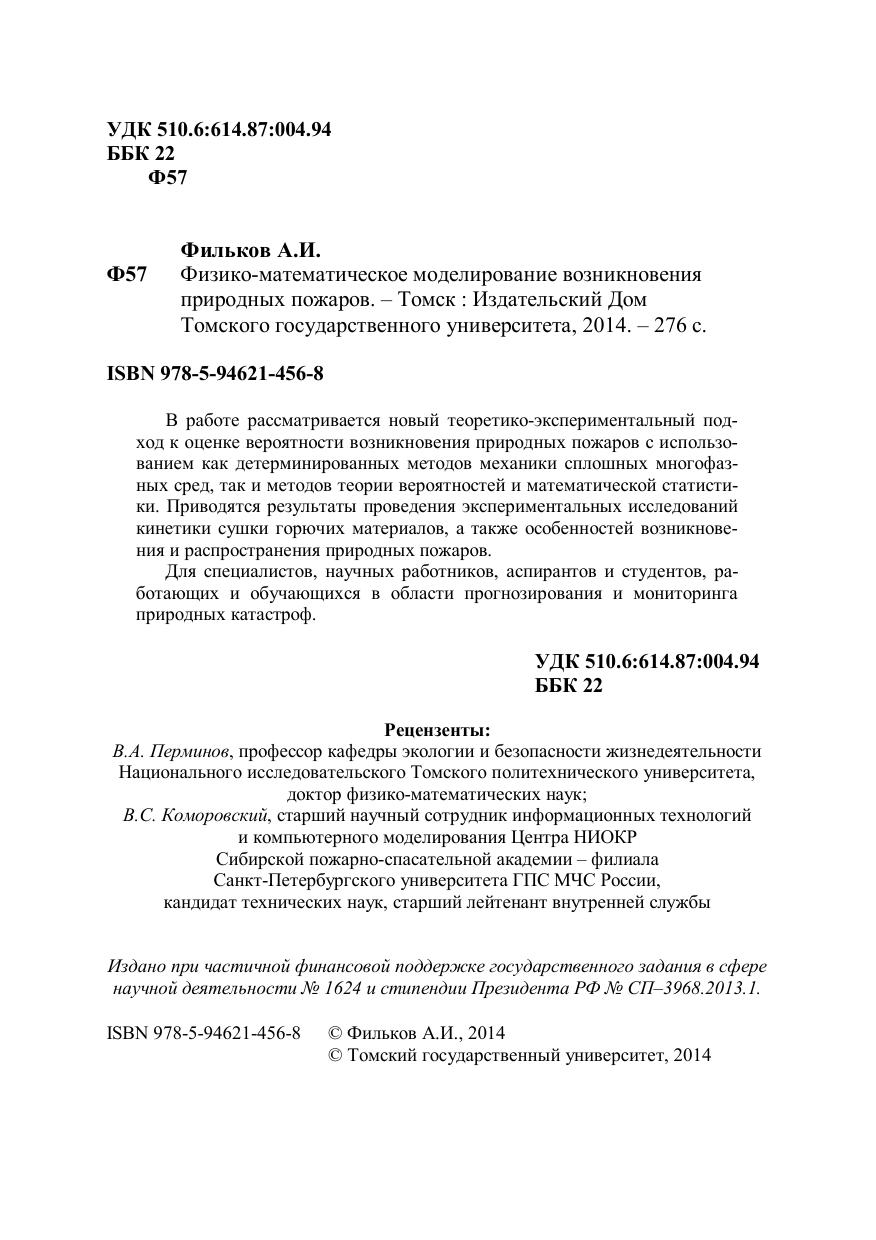 В работе рассматривается новый теоретико-экспериментальный подход к оценке вероятности возникновения природных пожаров с использованием как детерминированных методов механики сплошных многофазных сред, так и методов теории вероятностей и математической статистики. Приводятся результаты проведения экспериментальных исследований кинетики сушки горючих материалов, а также особенностей возникновения и распространения природных пожаров. Для специалистов, научных работников, аспирантов и студентов, работающих и обучающихся в области прогнозирования и мониторинга природных катастроф.