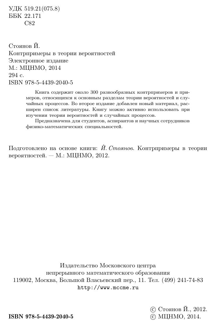 Книга содержит около 300 разнообразных контрпримеров и примеров, относящихся к основным разделам теории вероятностей и случайных процессов. Во второе издание добавлен новый материал, расширен список литературы. Книгу можно активно использовать при изучении теории вероятностей и случайных процессов. Предназначена для студентов, аспирантов и научных сотрудников физико-математических специальностей.