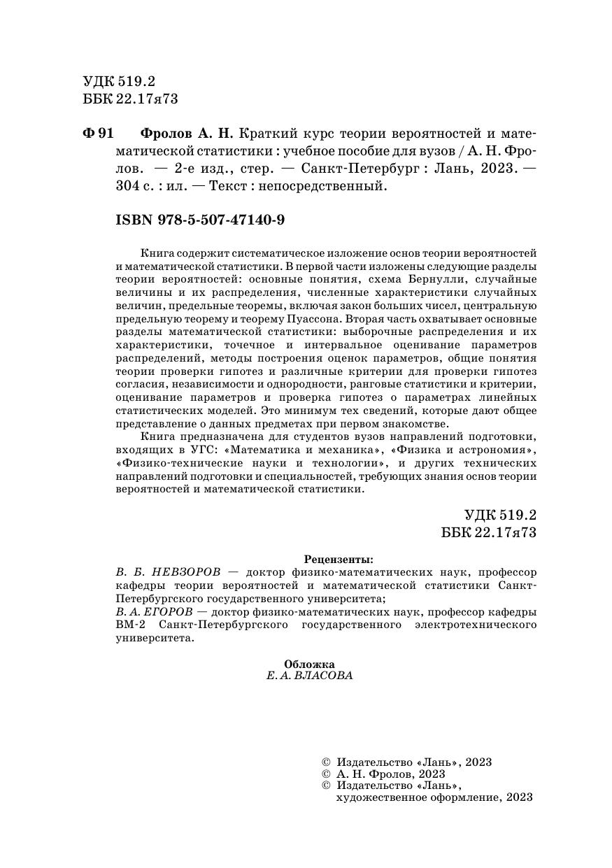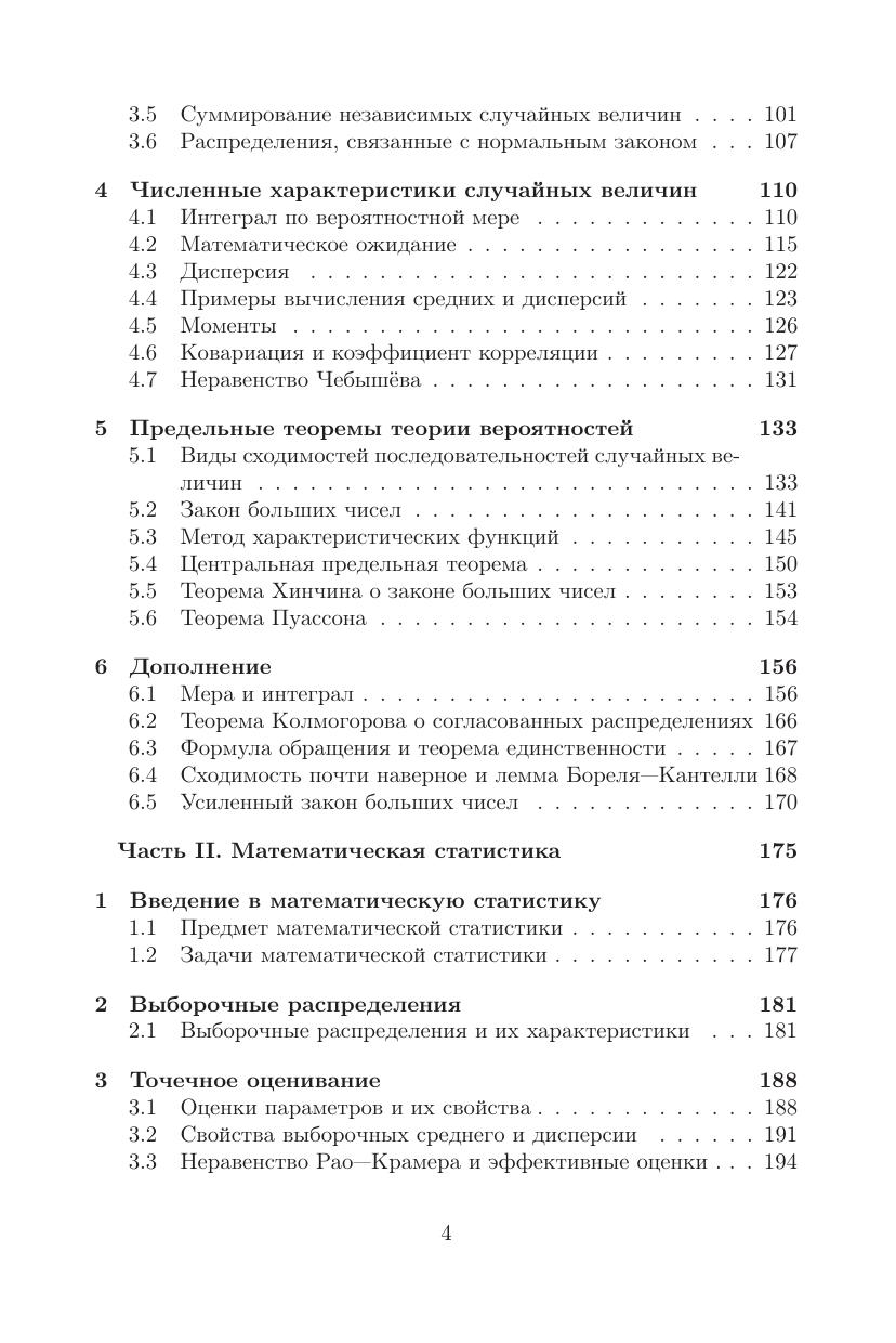 Книга содержит систематическое изложение основ теории вероятностей и математической статистики. В первой части изложены следующие разделы теории вероятностей: основные понятия, схема Бернулли, случайные величины и их распределения, численные характеристики случайных величин, предельные теоремы, включая закон больших чисел, центральную предельную теорему и теорему Пуассона. Вторая часть охватывает основные разделы математической статистики: выборочные распределения и их характеристики, точечное и интервальное оценивание параметров распределений, методы построения оценок параметров, общие понятия теории проверки гипотез и различные критерии для проверки гипотез согласия, независимости и однородности, ранговые статистики и критерии, оценивание параметров и проверка гипотез о параметрах линейных статистических моделей. Это минимум тех сведений, которые дают общее представление о данных предметах при первом знакомстве. Книга предназначена для студентов направлений подготовки, входящих в УГС: «Математика и механика», «Физика и астрономия», «Физико-технические науки и технологии», и других технических направлений подготовки и специальностей, требующих знания основ теории вероятностей и математической статистики.