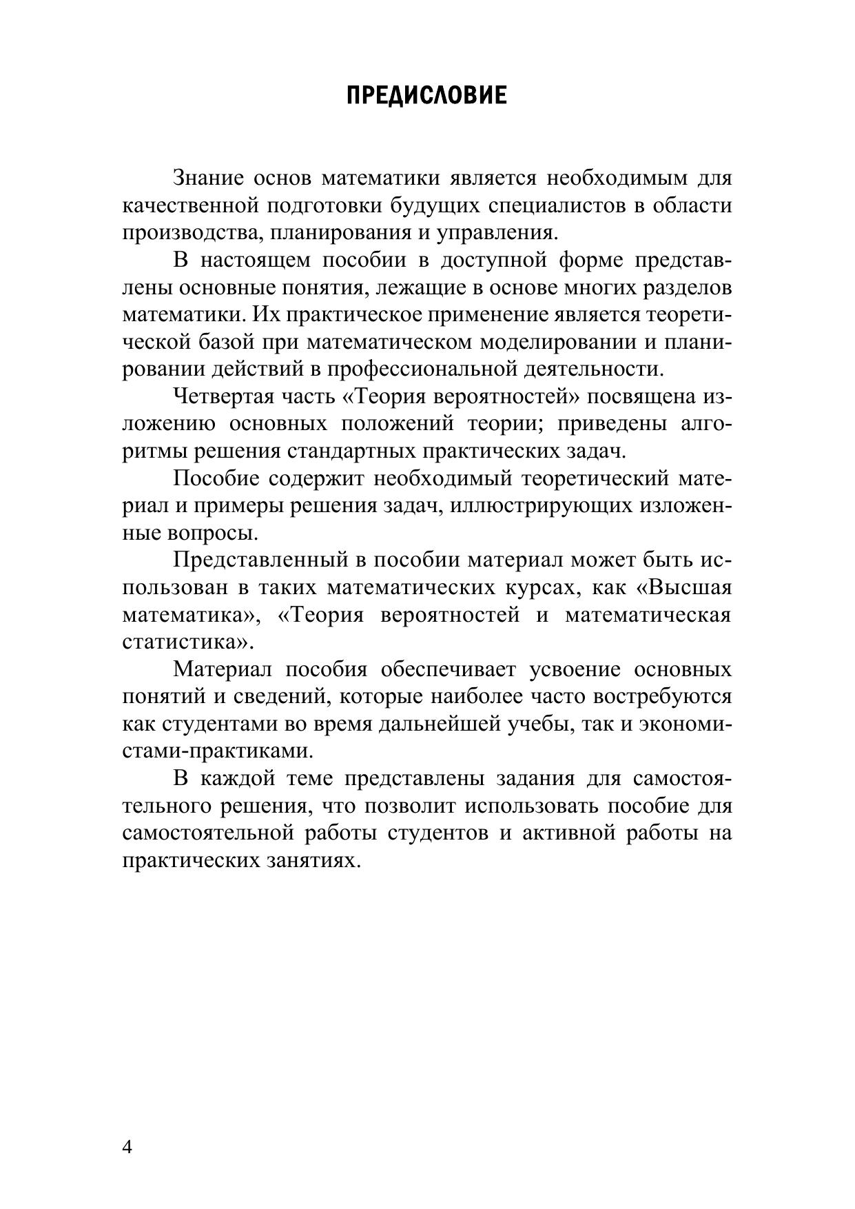 Учебно-методическое пособие содержит краткие теоретиче-ские сведения основных разделов математики, необходимые для выполнения практических заданий по математическим дисци-плинам. В четвертой части рассматриваются методы решения типо-вых задач и приводятся примеры с решением и подробными объ-яснениями. Задания для самостоятельного решения предполага-ется использовать при проведении практических занятий. Для студентов и слушателей экономических и гуманитарных специальностей и направлений подготовки.