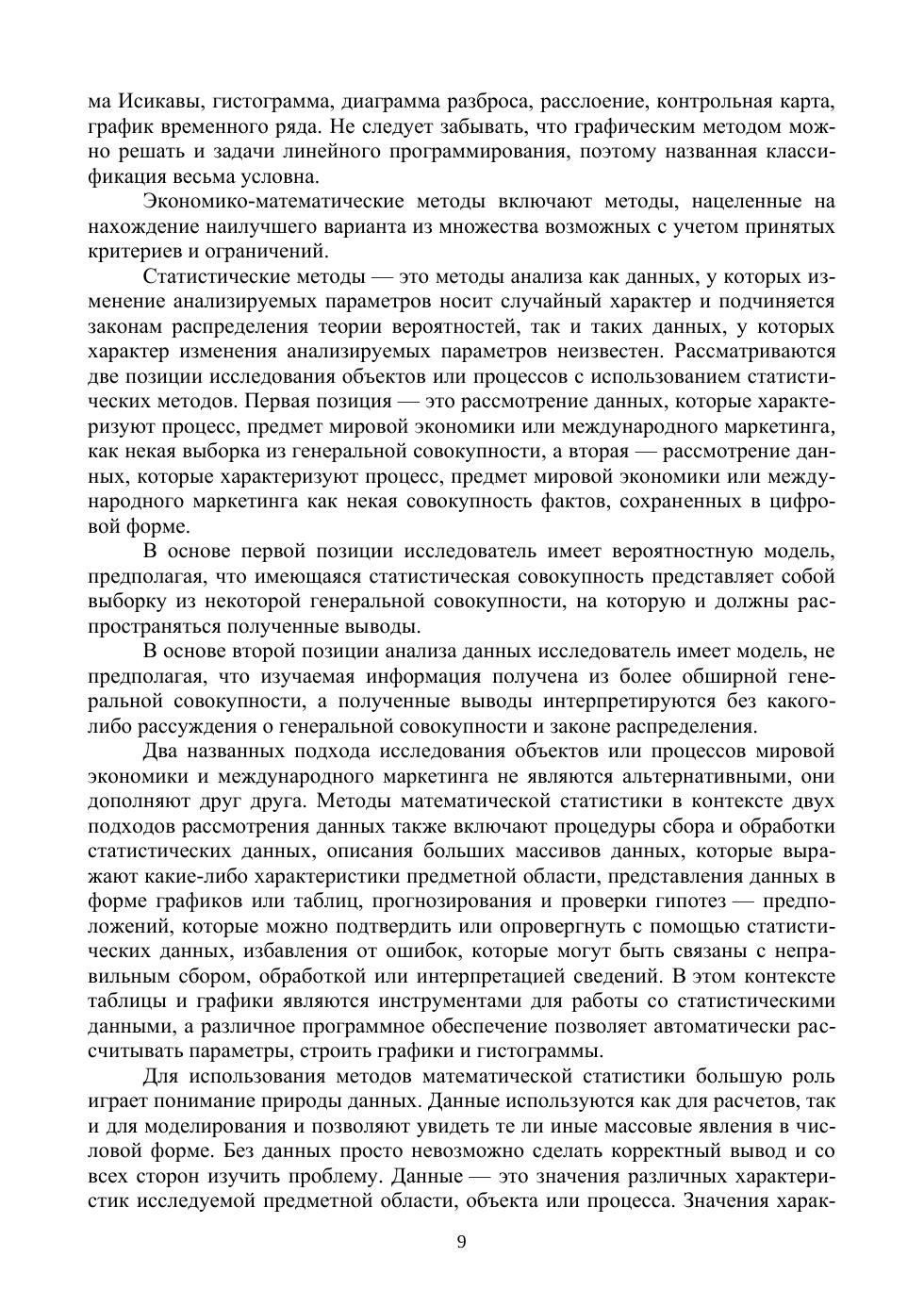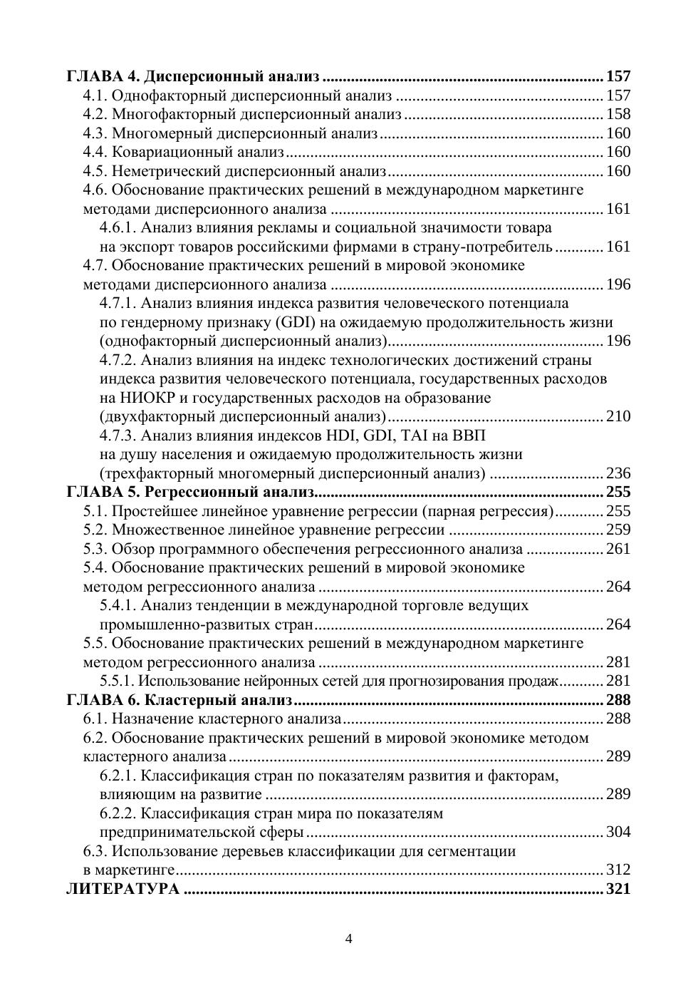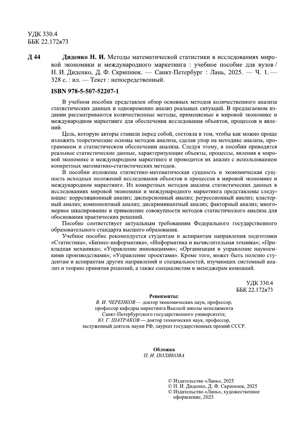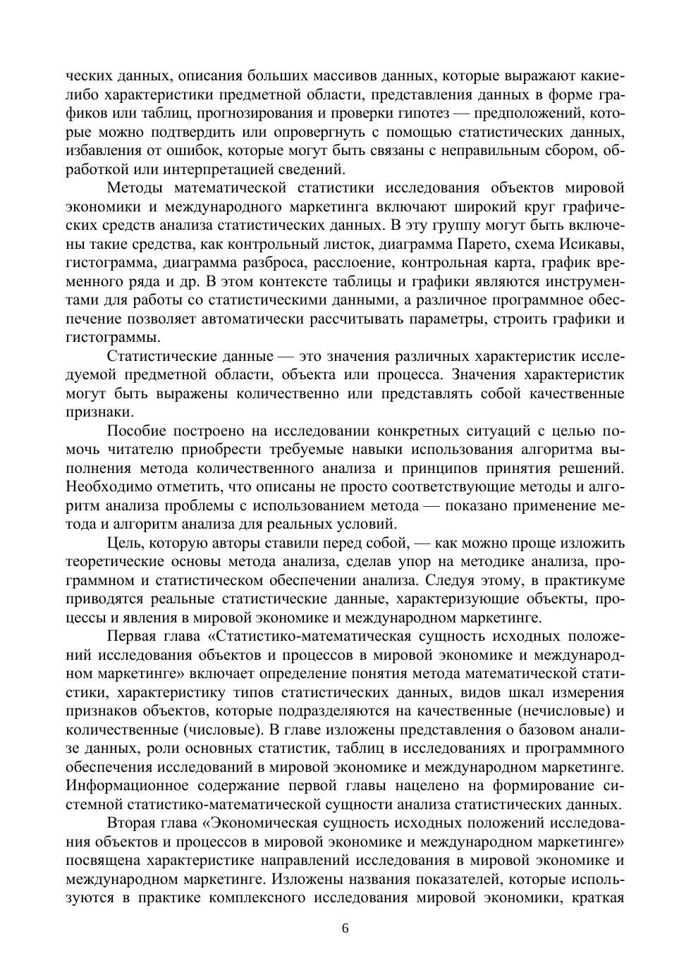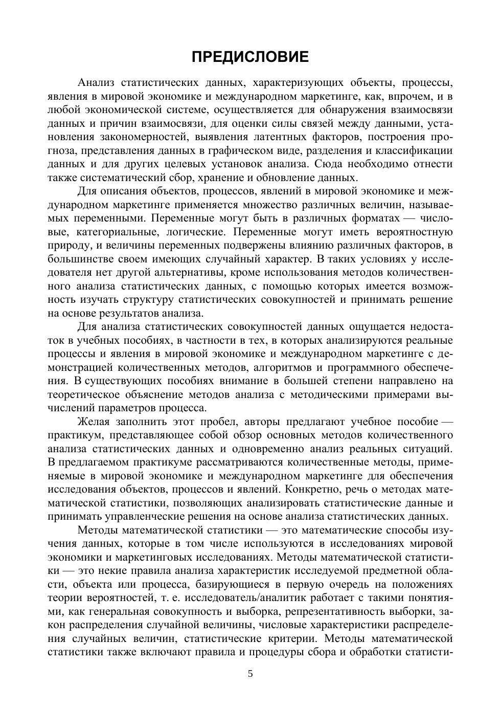 В учебном пособии представлен обзор основных методов количественного анали-за статистических данных и одновременно анализ реальных ситуаций. В предлагае-мом издании рассматриваются количественные методы, применяемые в мировой эко-номике и международном маркетинге для обеспечения исследования объектов, про-цессов и явлений. Цель, которую авторы ставили перед собой, состояла в том, чтобы как можно проще изложить теоретические основы методов анализа, сделав упор на методике анализа, программном и статистическом обеспечении анализа. Следуя этому, в пособии приводятся реальные статистические данные, характеризующие объекты, процессы, явления в мировой экономике и международном маркетинге и проводится их анализ с использованием конкретных математико-статистических методов. В пособии изложены статистико-математическая сущность и экономическая сущность исходных положений исследования объектов и процессов в мировой экономике и международном маркетинге. Из конкретных методов анализа статистических данных в исследованиях мировой экономики и международного маркетинга представлены следующие: корреляционный анализ, дисперсионный анализ, регрессионный анализ, кластерный анализ, компонентный анализ, дискриминантный анализ, факторный анализ, многомерное шкалирование и применение совокупности методов статистического анализа для обоснования практических решений. Пособие соответствует актуальным требованиям Федерального государственного образовательного стандарта высшего образования. Учебное пособие рекомендуется студентам и аспирантам направления подготовки «Статистика», «Бизнес-информатика», «Информатика и вычислительная техника», «При-кладная механика», «Управление инновациями», «Организация и управление наукоемкими производствами», «Управление проектами». Кроме того, может быть полезно студентам и аспирантам других направлений и специальностей, изучающих системный анализ и теорию принятия решений, а также специалистам и менеджерам компаний.