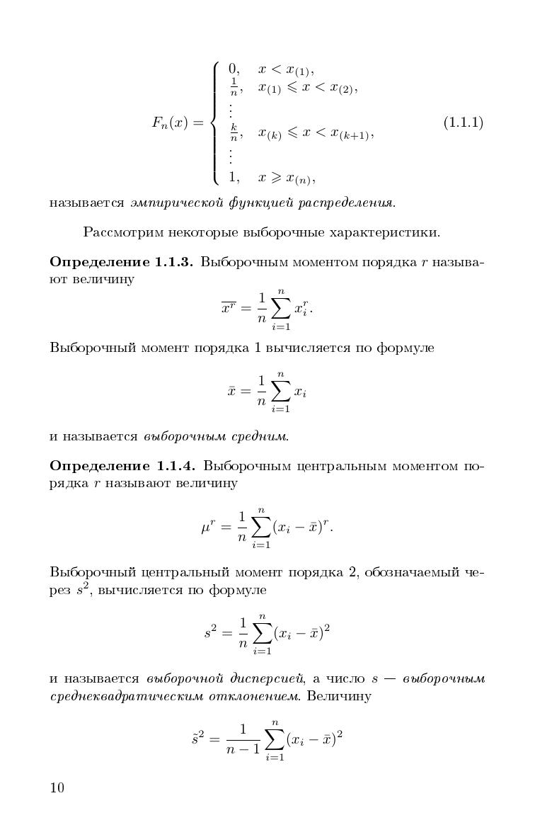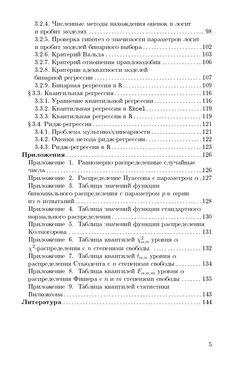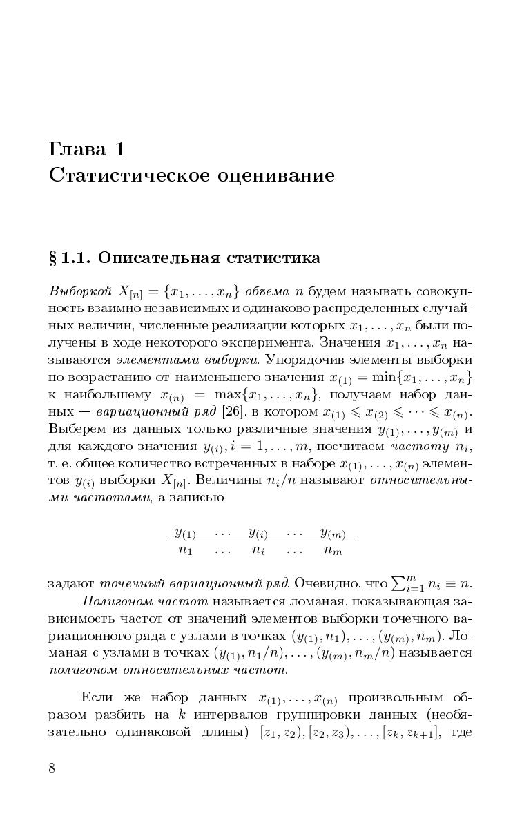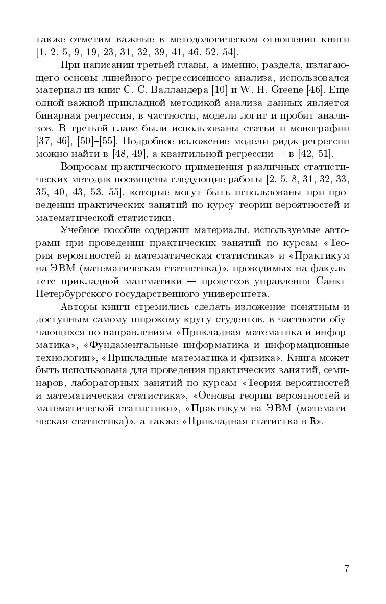В учебном пособии излагаются как основные разделы классического курса математической статистики, так и дополнительные разделы, не входящие в основной курс, но имеющие широкое применение на практике. В книгу включены такие разделы, как статистическое оценивание параметров (методы построения точечных оценок параметров и доверительных интервалов), проверка статистических гипотез, линейный и нелинейный регрессионный анализ, включая бинарную, ридж- и квантильную регрессии. Особое внимание уделяется реализации статистических методов в програамах R и Excel. Все разделы содержат примеры применения методов с использованием вышеупомянутых программ. В книгу включены наиболее часто встречающиеся статистические таблицы. Книга может быть рекомендована в качестве учебного пособия студентам университетов, обучающихся по направлениям "Прикладная математика и информатика", "Фундаментальная информатика и информационные технологии", "Прикладные математика и физика", а также научным работникам и специалистам, использующим методы математической статистики и классификации