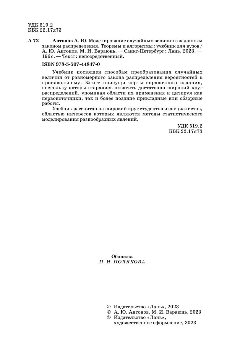 Учебник посвящен способам преобразования случайных величин от равномерного закона распределения вероятностей к произвольному. Книге присущи черты справочного издания, поскольку авторы старались охватить достаточно широкий круг распределений, упоминая области их применения и цитируя как первоисточники, так и более поздние прикладные или обзорные работы. Учебник рассчитан на широкий круг студентов и специалистов, областью интересов которых являются методы статистического моделирования разнообразных явлений.