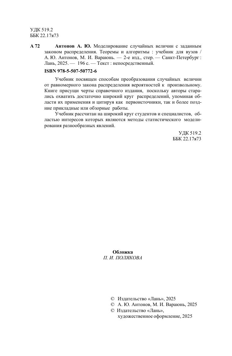 Учебник посвящен способам преобразования случайных величин от равномерного закона распределения вероятностей к произвольному. Книге присущи черты справочного издания, поскольку авторы старались охватить достаточно широкий круг распределений, упоминая области их применения и цитируя как первоисточники, так и более поздние прикладные или обзорные работы. Учебник рассчитан на широкий круг студентов и специалистов, областью интересов которых являются методы статистического моделирования разнообразных явлений.