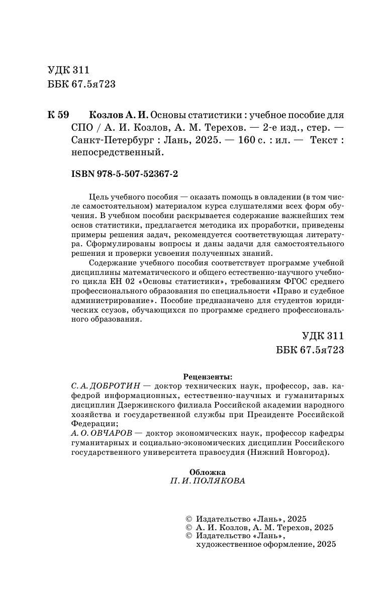 Цель учебного пособия — оказать помощь в овладении (в том числе самостоятельном) материалом курса слушателями всех форм обучения. В учебном пособии раскрывается содержание важнейших тем основ статистики, предлагается методика их проработки, приведены примеры решения задач, рекомендуется соответствующая литература. Сформулированы вопросы и даны задачи для самостоятельного решения и проверки усвоения полученных знаний. Содержание учебного пособия соответствует программе учебной дисциплины математического и общего естественно-научного учебного цикла ЕН 02 «Основы статистики», требованиям ФГОС среднего профессионального образования по специальности «Право и судебное администрирование». Пособие предназначено для студентов юридических ссузов, обучающихся по программе среднего профессионального образования.
