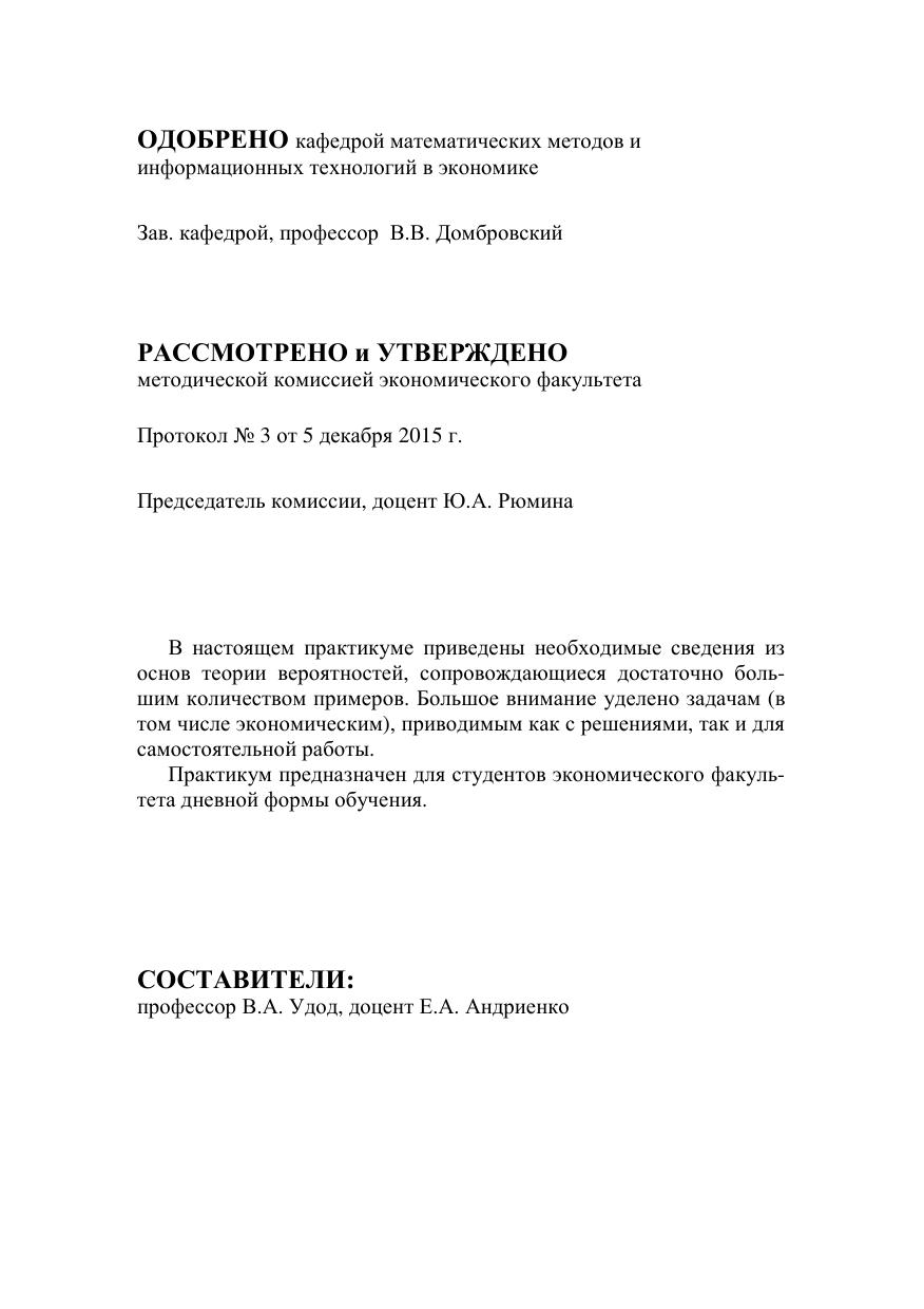 В настоящем практикуме приведены необходимые сведения из основ теории вероятностей, сопровождающиеся достаточно боль- шим количеством примеров. Большое внимание уделено задачам (в том числе экономическим), приводимым как с решениями, так и для самостоятельной работы. Практикум предназначен для студентов экономического факультета дневной формы обучения.