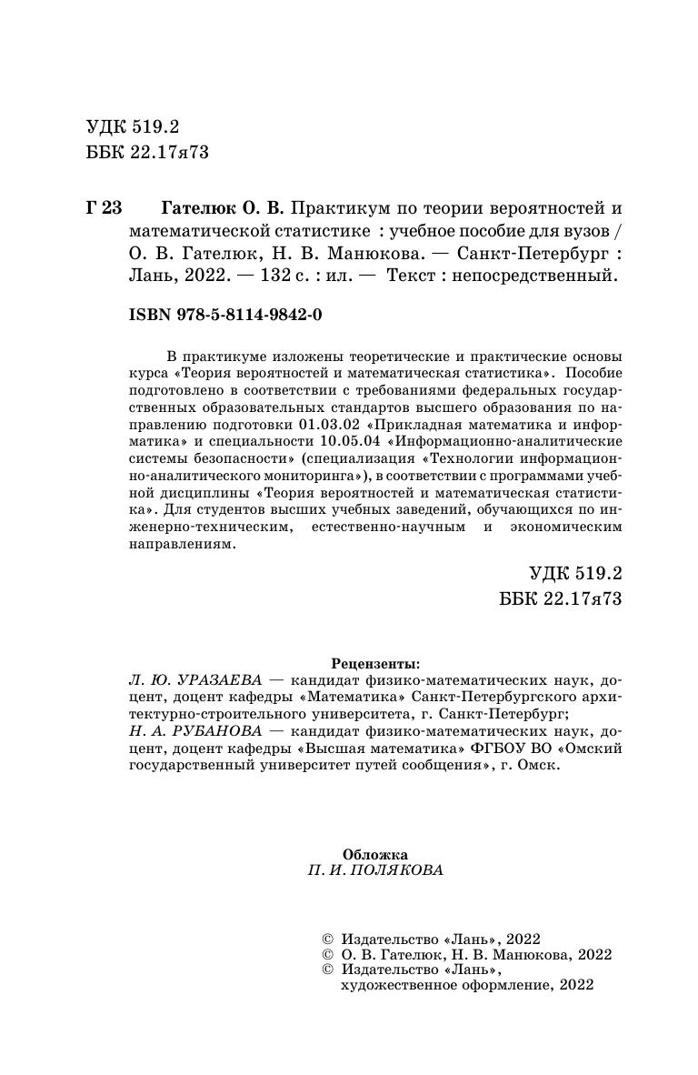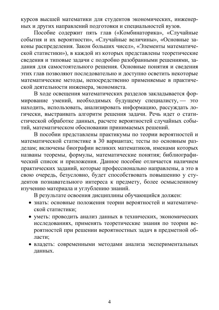 В практикуме изложены теоретические и практические основы курса «Теория вероятностей и математическая статистика». Пособие подготовлено в соответствии с требованиями федеральных государственных образовательных стандартов высшего образования по направлению подготовки 01.03.02 «Прикладная математика и информатика» и специальности 10.05.04 «Информационно-аналитические системы безопасности» (специализация «Технологии информационно-аналитического мониторинга»), в соответствии с программами учебной дисциплины «Теория вероятностей и математическая статистика». Для студентов высших учебных заведений, обучающихся по инженерно-техническим, естественно-научным и экономическим направлениям.