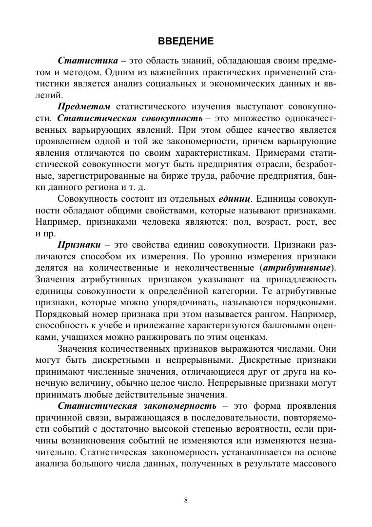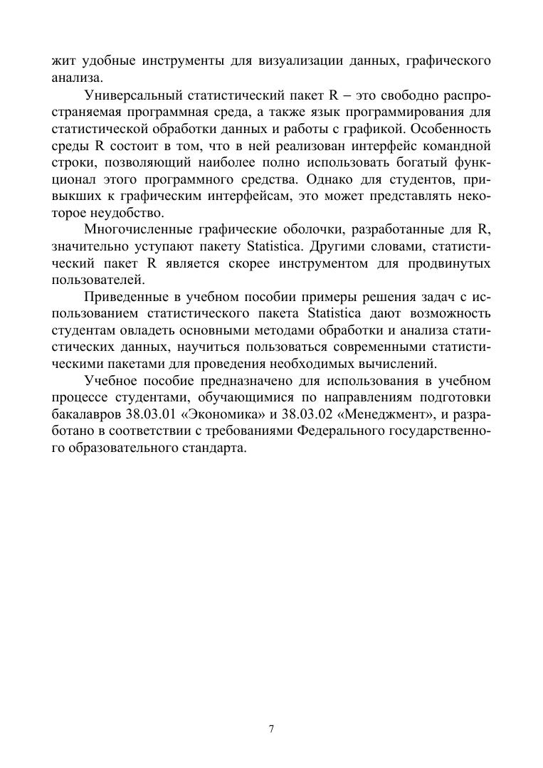В каждой главе приведены типовые примеры с подробными решениями. Показаны решения с использованием статистического пакета Statistica. Эти примеры дают возможность студентам овладеть основными методами обработки и анализа статистических данных, научиться пользоваться современными статистическими пакетами для проведения необходимых вычислений.