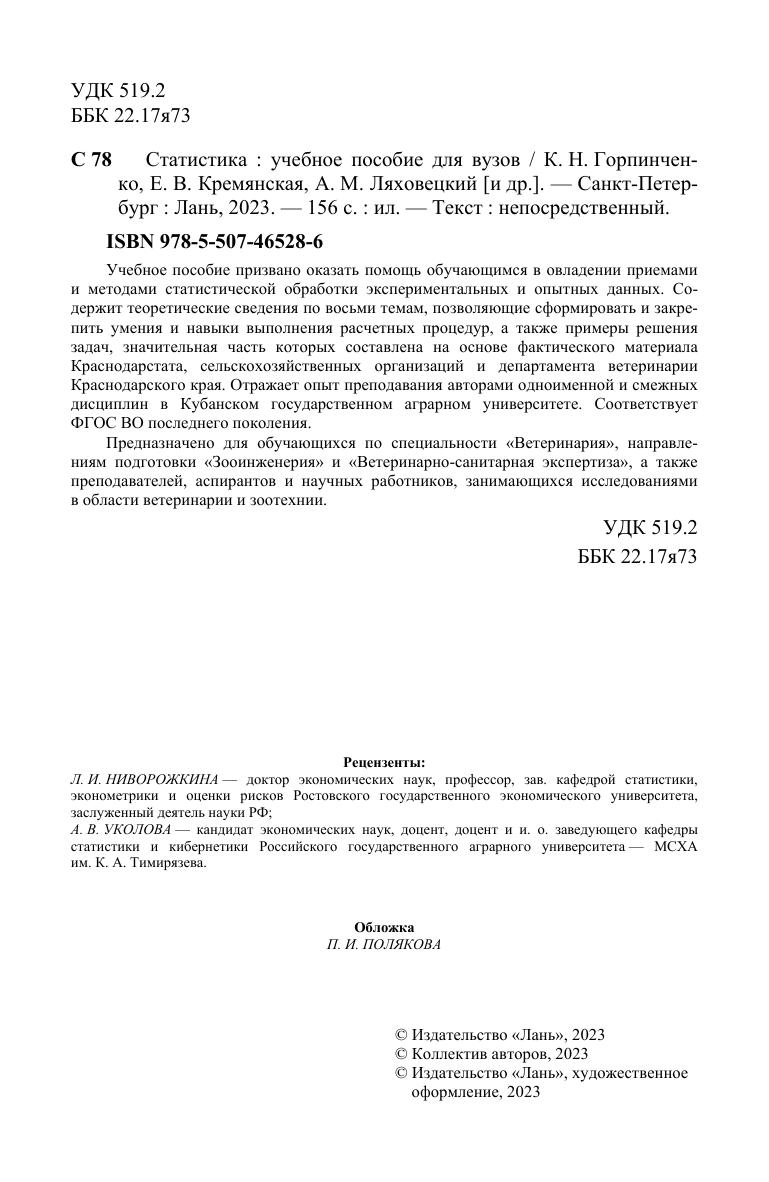 Учебное пособие призвано оказать помощь обучающимся в овладении приемами и методами статистической обработки экспериментальных и опытных данных. Содержит теоретические сведения по восьми темам, позволяющие сформировать и закрепить умения и навыки выполнения расчетных процедур, а также примеры решения задач, значительная часть которых составлена на основе фактического материала Краснодарстата, сельскохозяйственных организаций и департамента ветеринарии Краснодарского края. Отражает опыт преподавания авторами одноименной и смежных дисциплин в Кубанском государственном аграрном университете. Соответствует ФГОС ВО последнего поколения. Предназначено для обучающихся по специальности «Ветеринария», направлениям подготовки «Зооинженерия» и «Ветеринарно-санитарная экспертиза», а также преподавателей, аспирантов и научных работников, занимающихся исследованиями в области ветеринарии и зоотехнии.