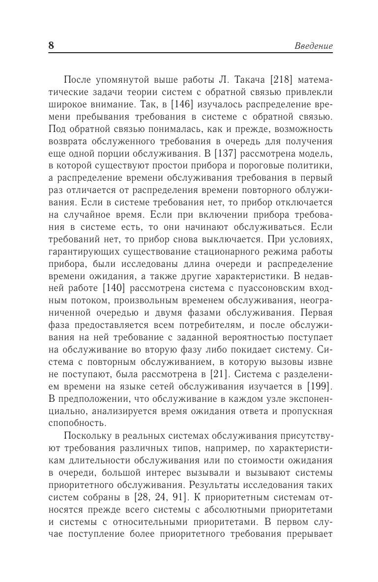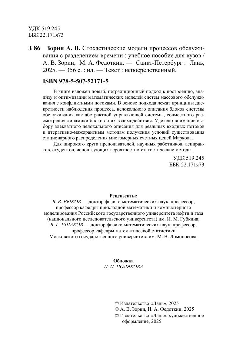 В книге изложен новый, нетрадиционный подход к построению, анализу и оптимизации математических моделей систем массового обслуживания с конфликтными потоками. В основе подхода лежат принципы дискретности наблюдения процесса, нелокального описания блоков системы обслуживания как абстрактной управляющей системы, совместного рассмотрения динамики блоков и их взаимодействия. Уделено внимание выбору адекватного нелокального описания для реальных входных потоков и итеративно-мажорантным методам получения условий существования стационарного распределения многомерных счетных цепей Маркова. Для широкого круга преподавателей, научных работников, аспирантов, студентов, использующих вероятностно-статистические методы.