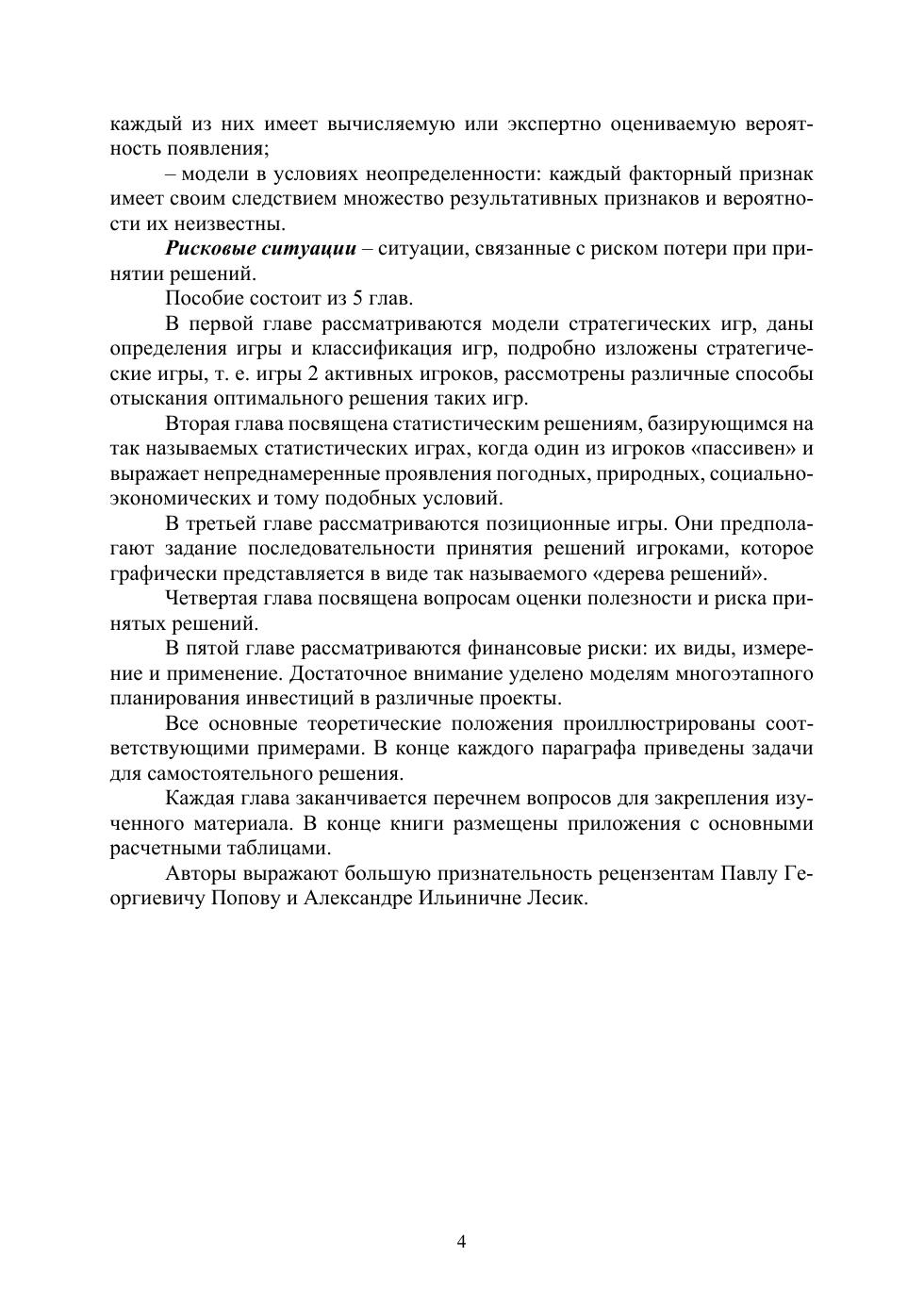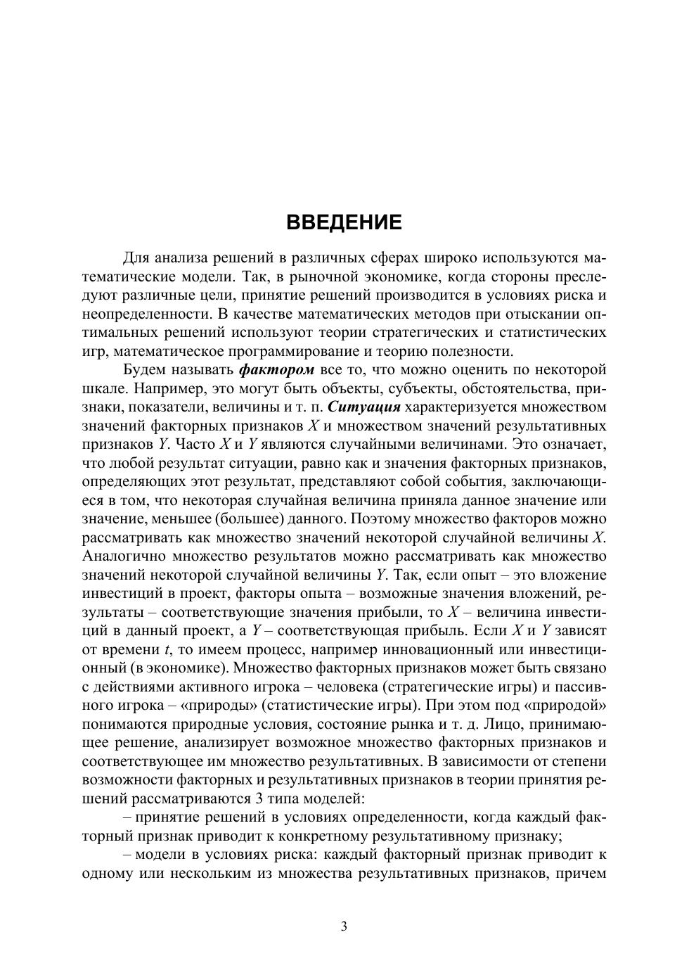 Рассмотрены стратегические игры, статистические решения, позиционные игры, оценка полезности и риска принятых решений, финансовые риски. Основные теоретические положения принятия решений проиллюстрированы соответствующими примерами. В конце каждой главы приведены вопросы и задачи для самостоятельного решения. Это позволяет закрепить изученный материал и приобрести навыки практического применения и обобщения рассмотренных методов и моделей.