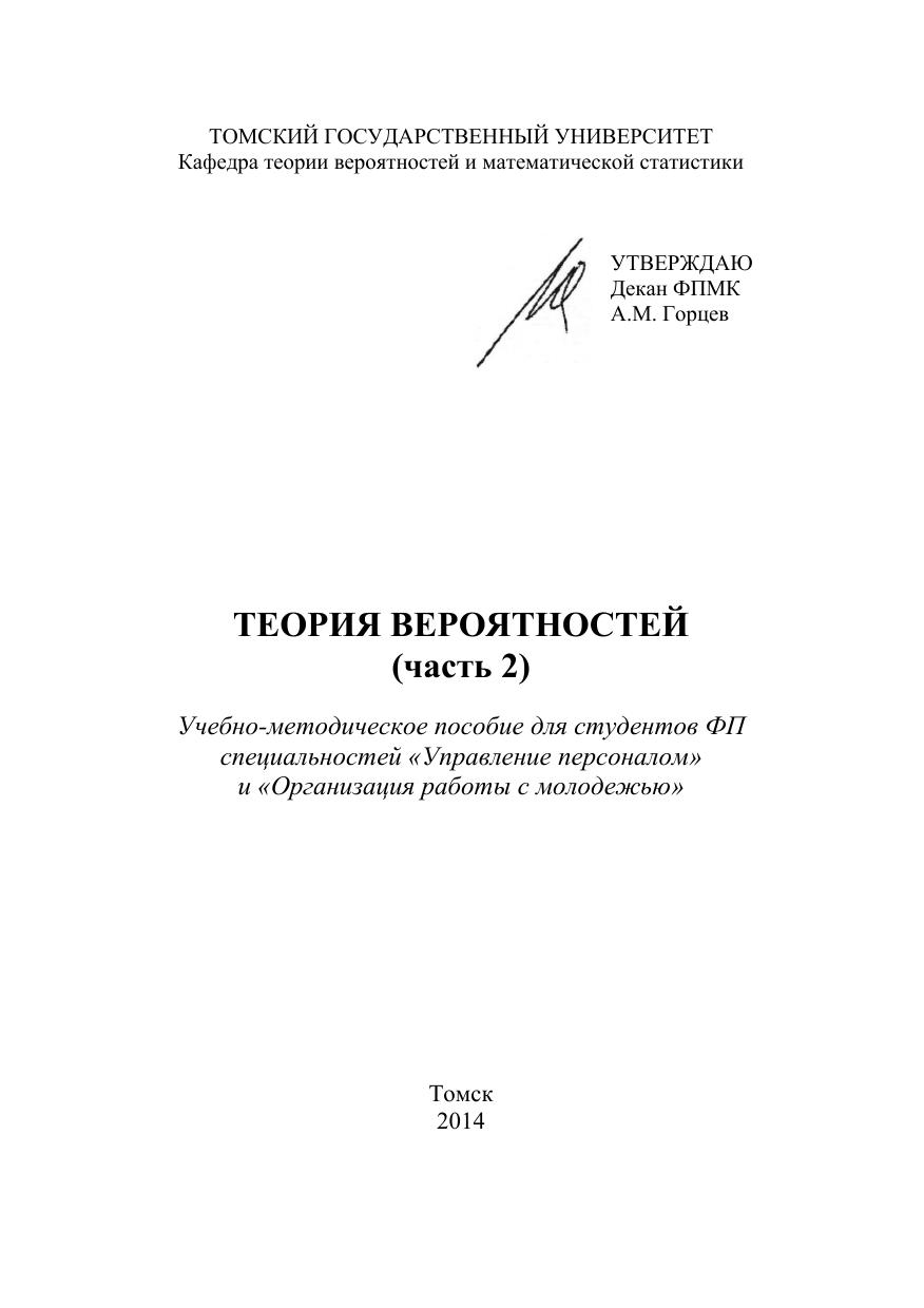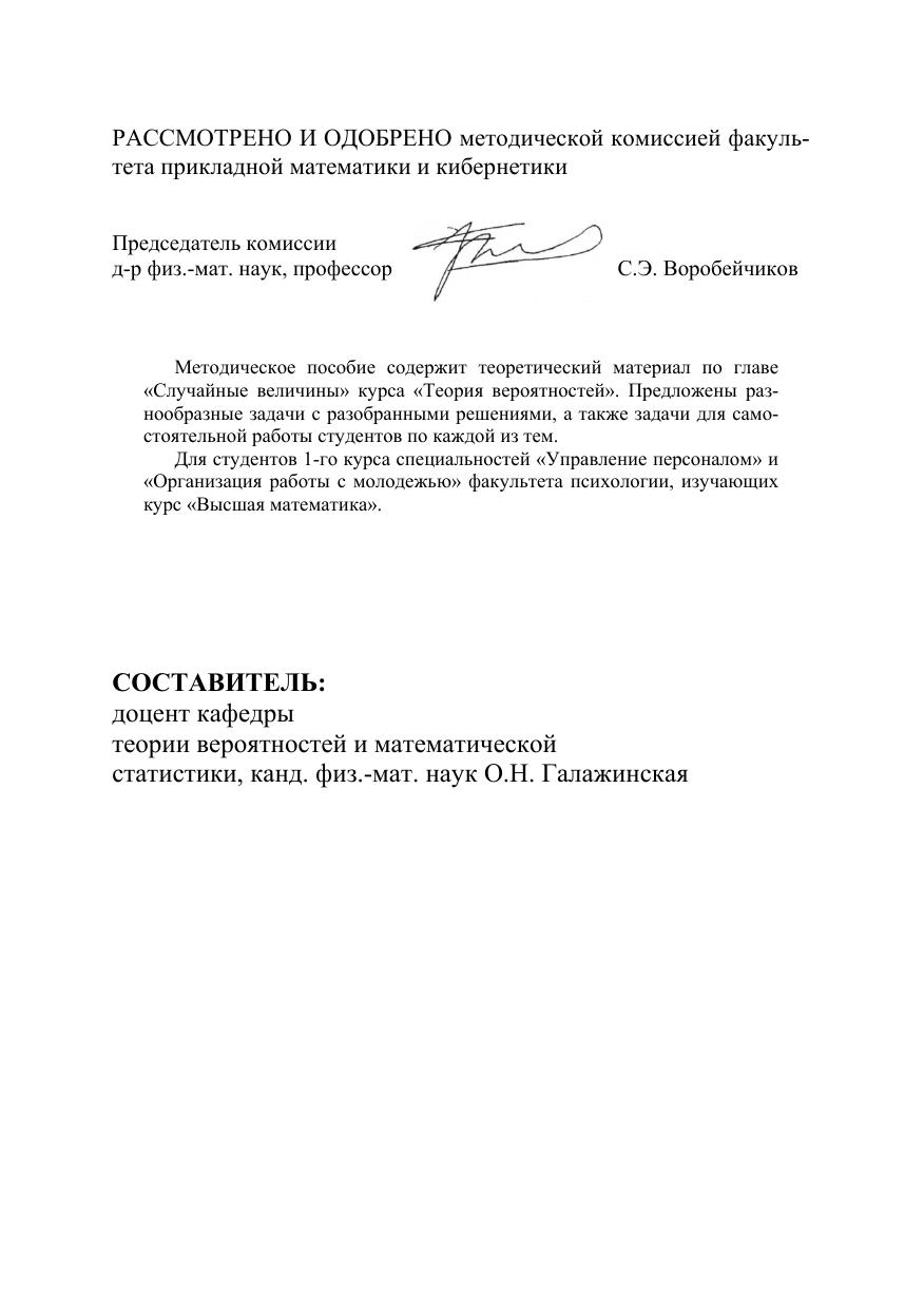Методическое пособие содержит теоретический материал по главе «Случайные величины» курса «Теория вероятностей». Предложены разнообразные задачи с разобранными решениями, а также задачи для самостоятельной работы студентов по каждой из тем. Для студентов 1-го курса специальностей «Управление персоналом» и «Организация работы с молодежью» факультета психологии, изучающих курс «Высшая математика».