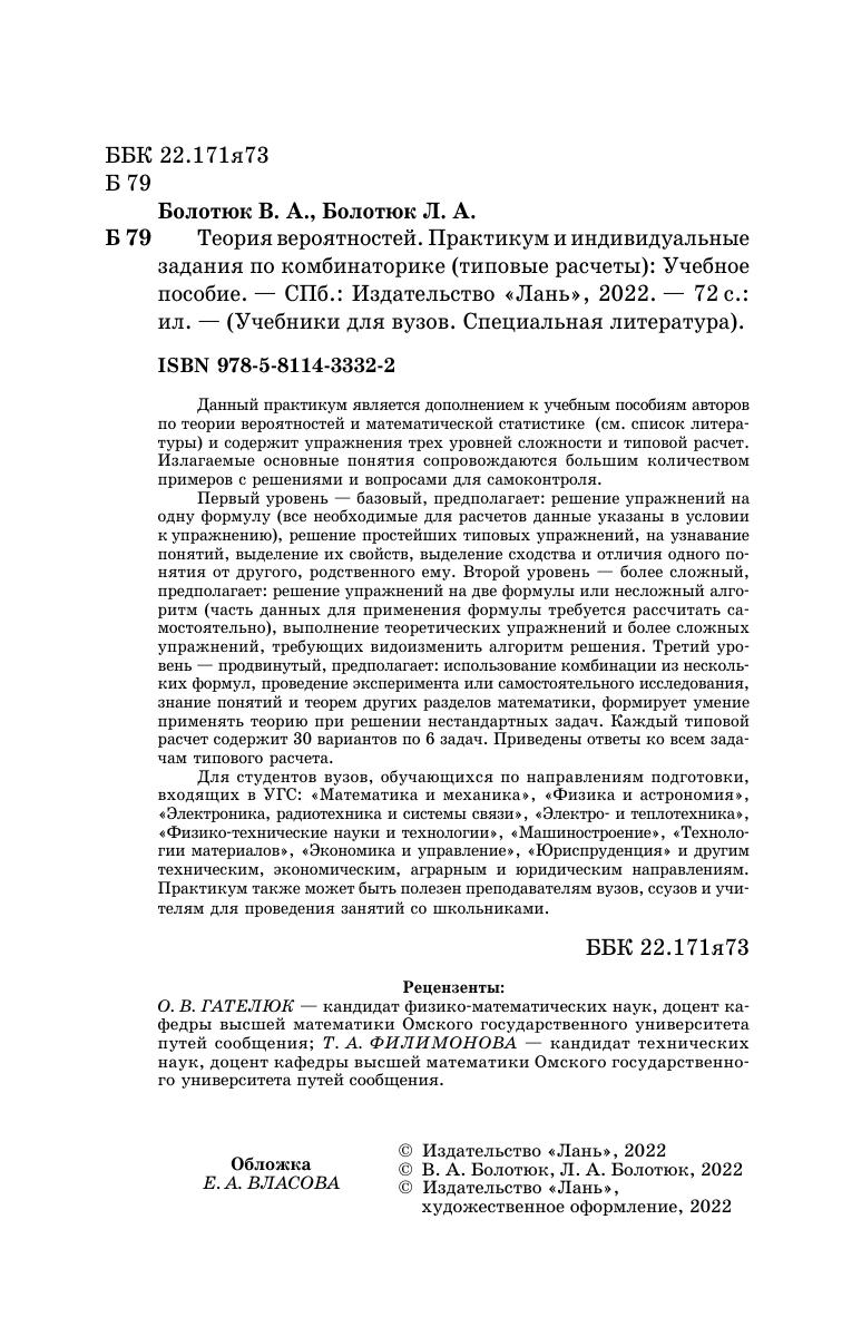 Данный практикум является дополнением к учебным пособиям авторов по теории вероятностей и математической статистике (см. список литературы) и содержит упражнения трех уровней сложности и типовой расчет. Излагаемые основные понятия сопровождаются большим количеством примеров с решениями и вопросами для самоконтроля. Первый уровень — базовый, предполагает: решение упражнений на одну формулу (все необходимые для расчетов данные указаны в условии к упражнению), решение простейших типовых упражнений, на узнавание понятий, выделение их свойств, выделение сходства и отличия одного понятия от другого, родственного ему. Второй уровень — более сложный, предполагает: решение упражнений на две формулы или несложный алгоритм (часть данных для применения формулы требуется рассчитать самостоятельно), выполнение теоретических упражнений и более сложных упражнений, требующих видоизменить алгоритм решения. Третий уровень — продвинутый, предполагает: использование комбинации из нескольких формул, проведение эксперимента или самостоятельного исследования, знание понятий и теорем других разделов математики, формирует умение применять теорию при решении нестандартных задач. Каждый типовой расчет содержит 30 вариантов по 6 задач. Приведены ответы ко всем задачам типового расчета. Для студентов вузов, обучающихся по направлениям подготовки, входящих в УГС: «Математика и механика», «Физика и астрономия», «Электроника, радиотехника и системы связи», «Электро- и теплотехника», «Физико-технические науки и технологии», «Машиностроение», «Технологии материалов», «Экономика и управление», «Юриспруденция» и другим техническим, экономическим, аграрным и юридическим направлениям. Практикум так же может быть полезен преподавателям вузов, ссузов и учителям для проведения занятий со школьниками.