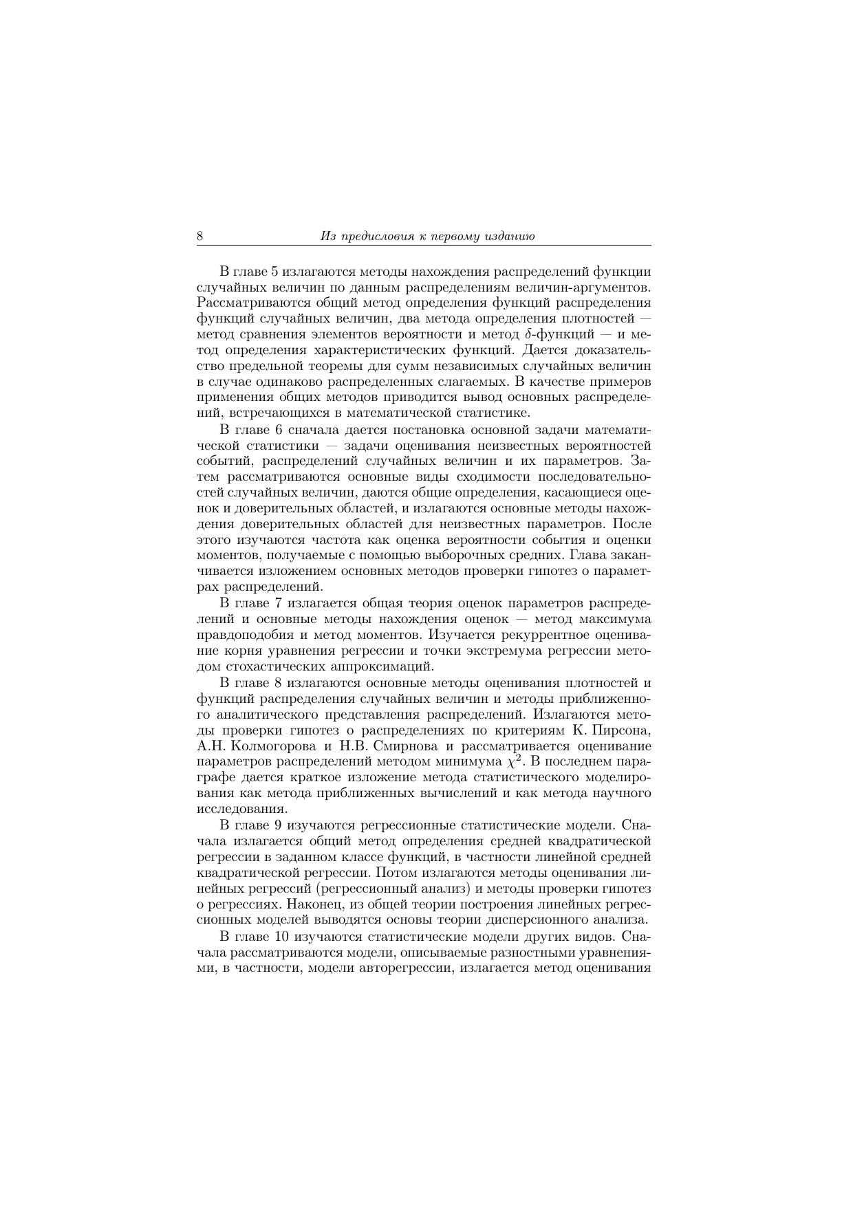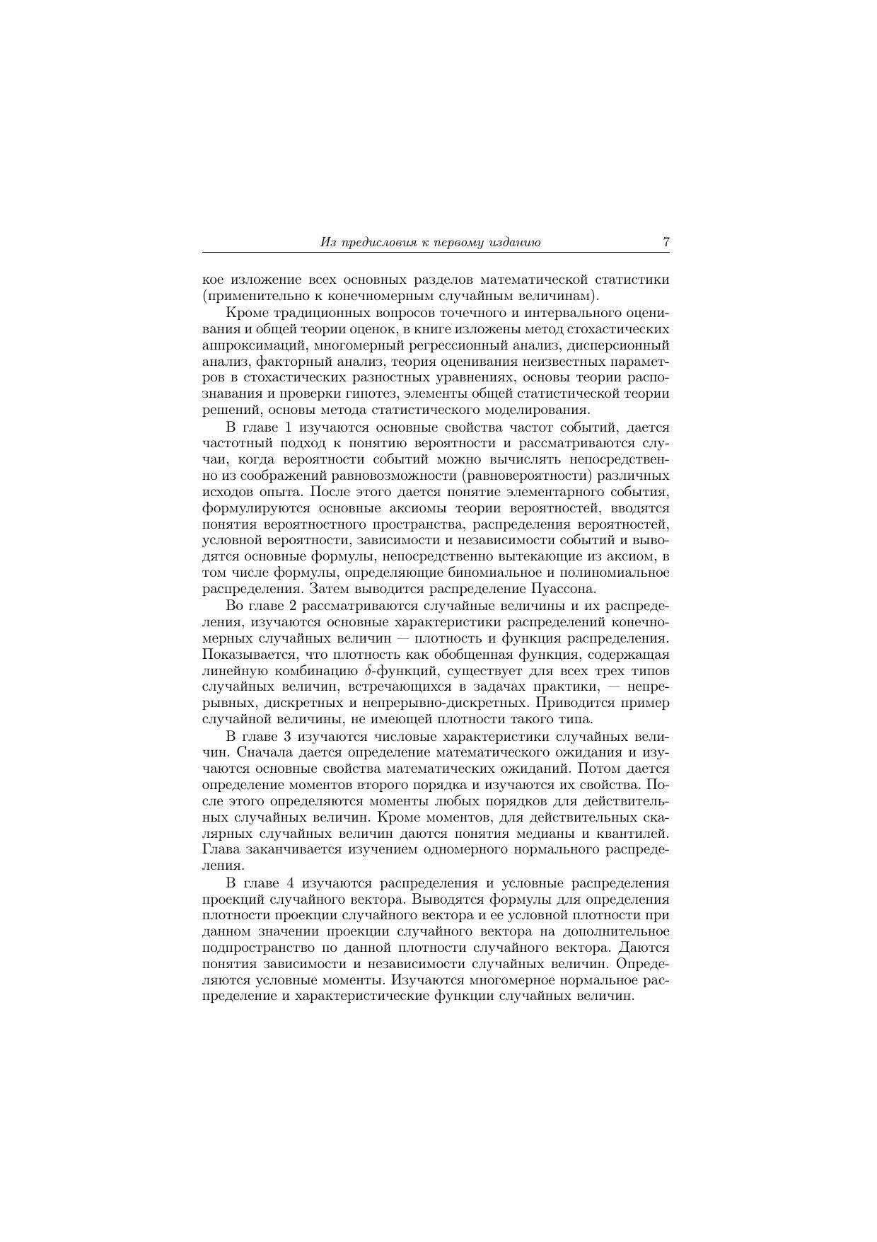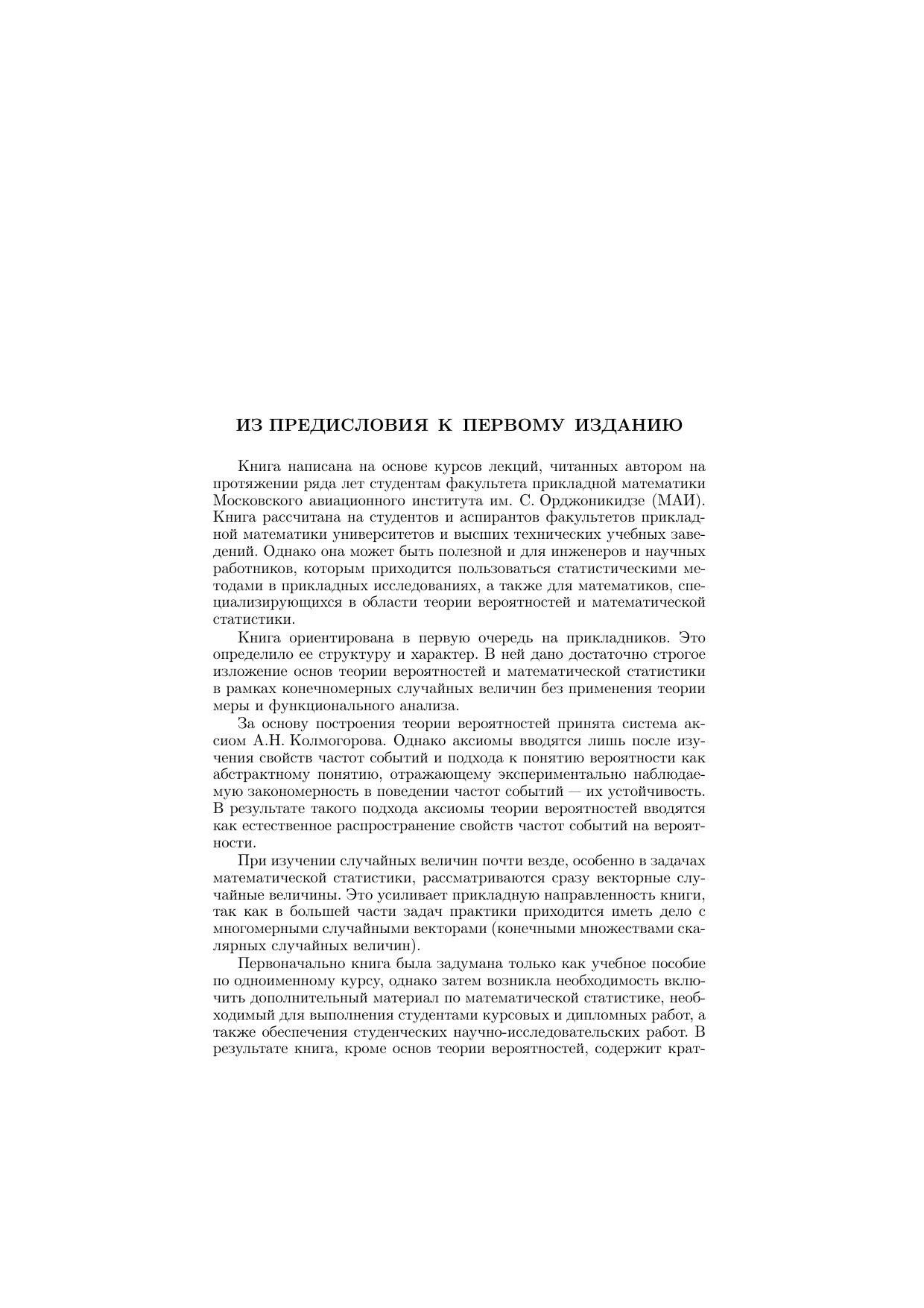 В книге изложены основы теории вероятностей и математической статистики. В первых пяти главах дается достаточно строгое изложение основ теории вероятностей в рамках конечномерных случайных величин на основе традиционных курсов математического анализа и линейной алгебры. В последующих пяти главах изложены основы математической статистики: точечное и интервальное оценивание параметров распределений, плотностей и функций распределения, общая теория оценок, метод стохастических аппроксимаций, методы построения статистических моделей. Первое издание - 1979 г. Книга предназначена для студентов и аспирантов факультетов прикладной математики вузов и для инженеров.