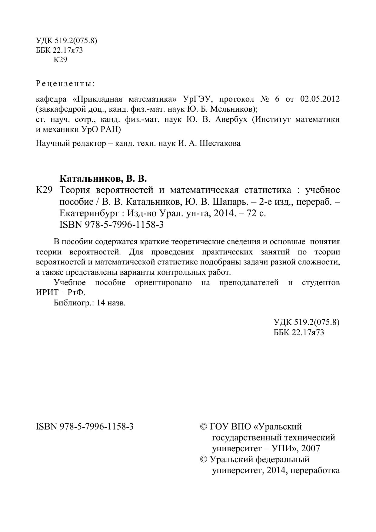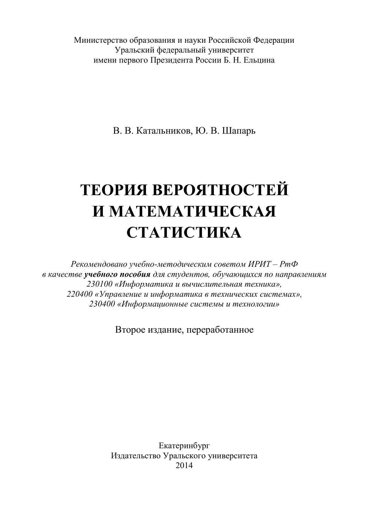 В пособии содержатся краткие теоретические сведения и основные понятия теории вероятностей. Для проведения практических занятий по теории вероятностей и математической статистике подобраны задачи разной сложности, а также представлены варианты контрольных работ. Учебное пособие ориентировано на преподавателей и студентов ИРИТ – РтФ.