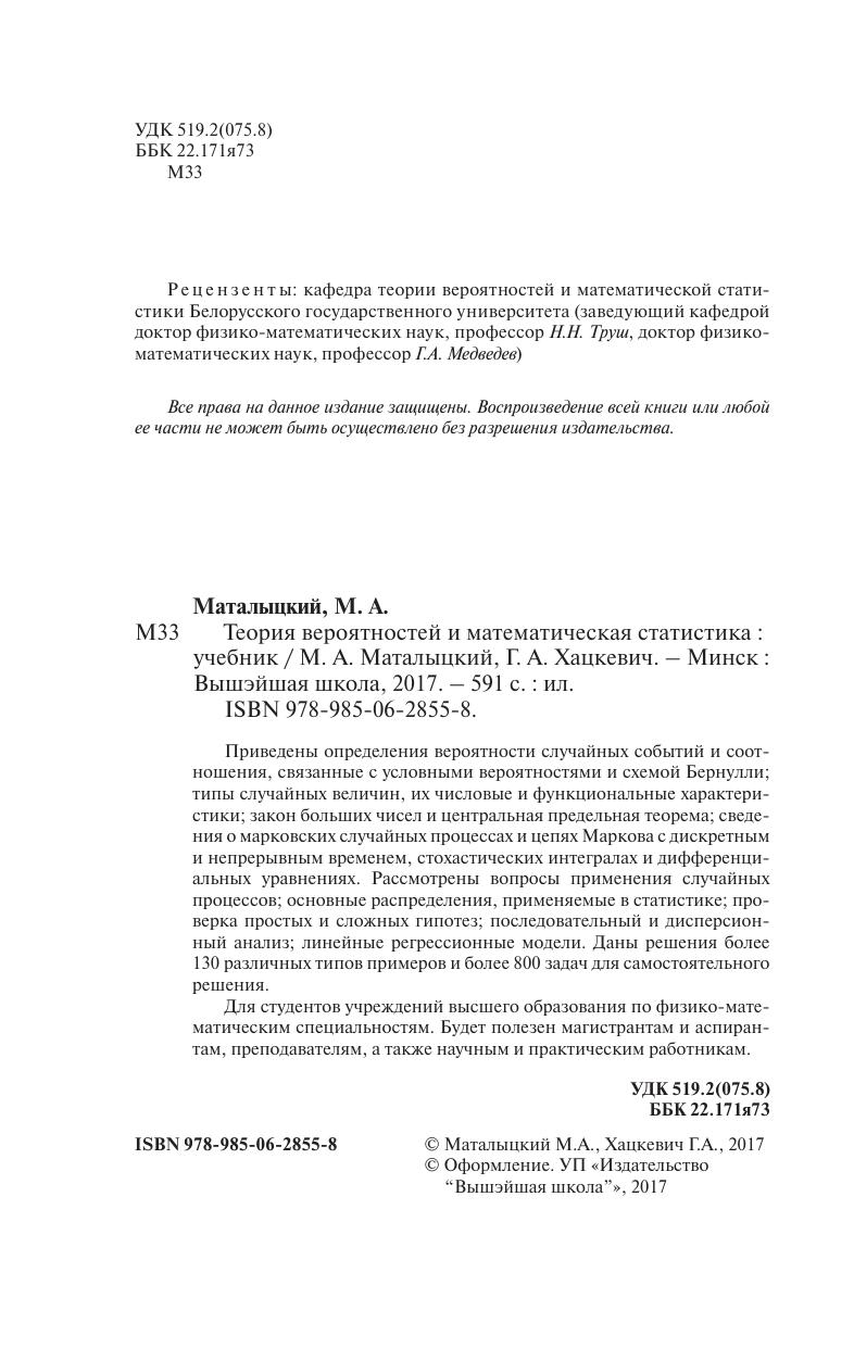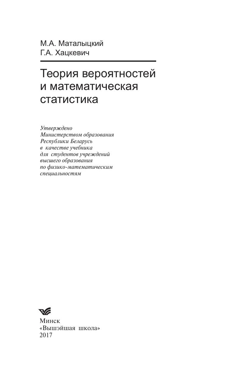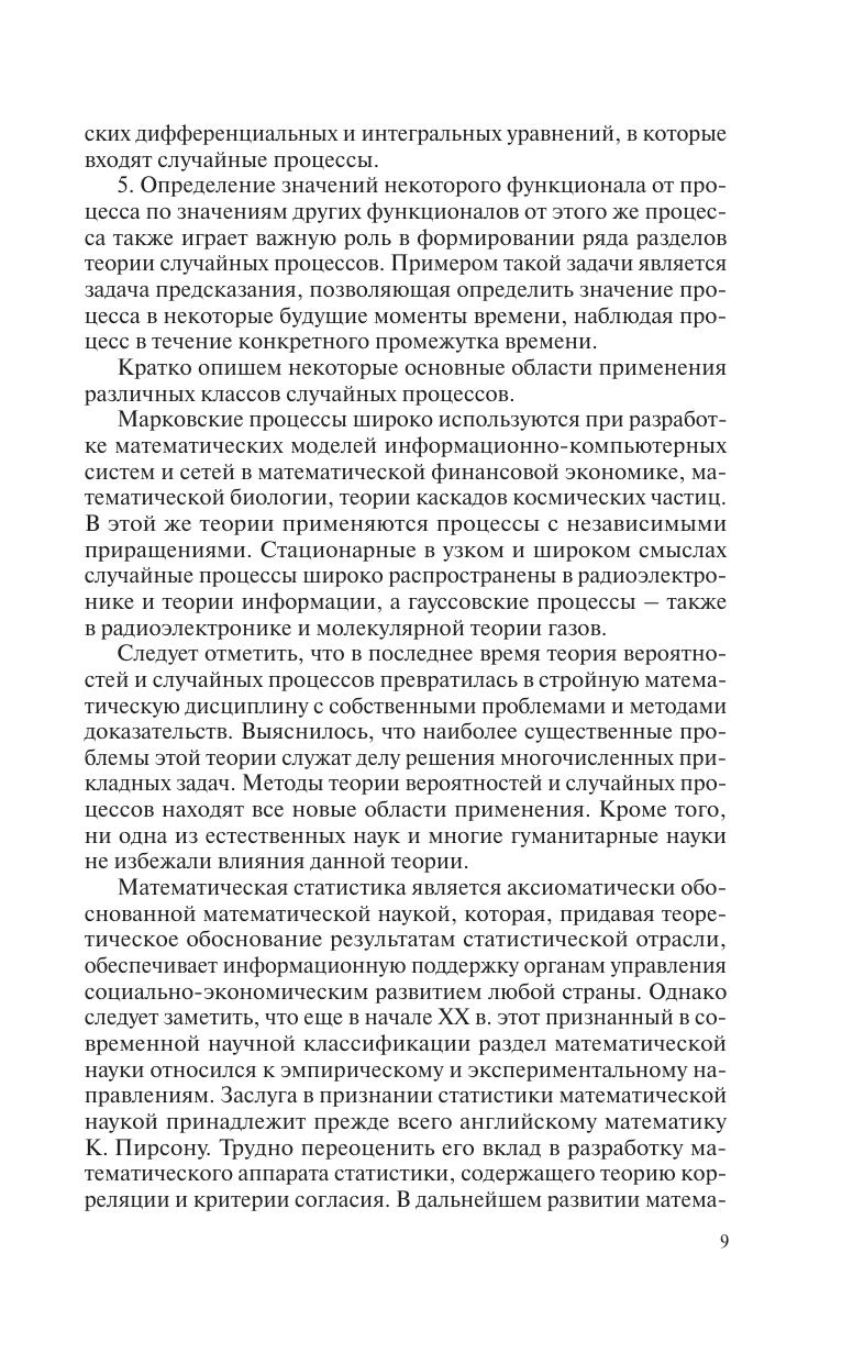 Приведены определения вероятности случайных событий и соотношения, связанные с условными вероятностями и схемой Бернулли; типы случайных величин, их числовые и функциональные характеристики; закон больших чисел и центральная предельная теорема; сведения о марковских случайных процессах и цепях Маркова с дискретным и непрерывным временем, стохастических интегралах и дифференциальных уравнениях. Рассмотрены вопросы применения случайных процессов; основные распределения, применяемые в статистике; проверка простых и сложных гипотез; последовательный и дисперсионный анализ; линейные регрессионные модели. Даны решения более 130 различных типов примеров и более 800 задач для самостоятельного решения. Для студентов учреждений высшего образования по физико-математическим специальностям. Будет полезен магистрантам и аспирантам, преподавателям, а также научным и практическим работникам.