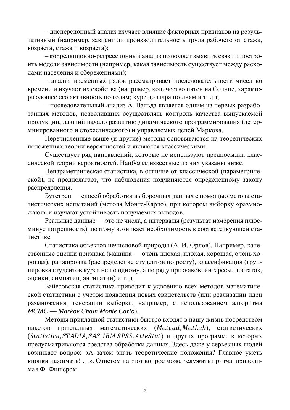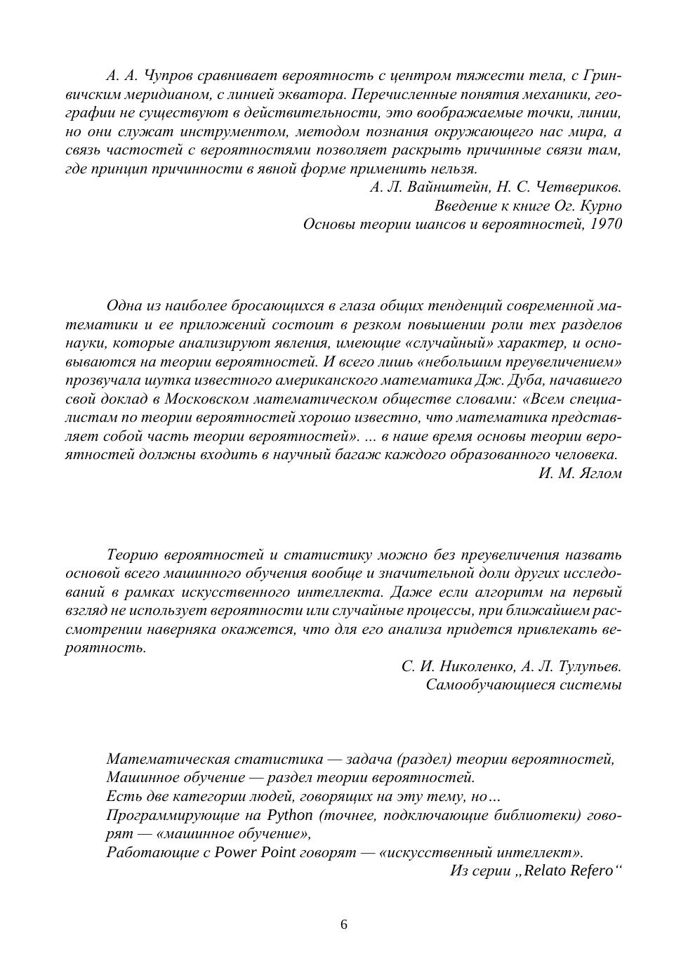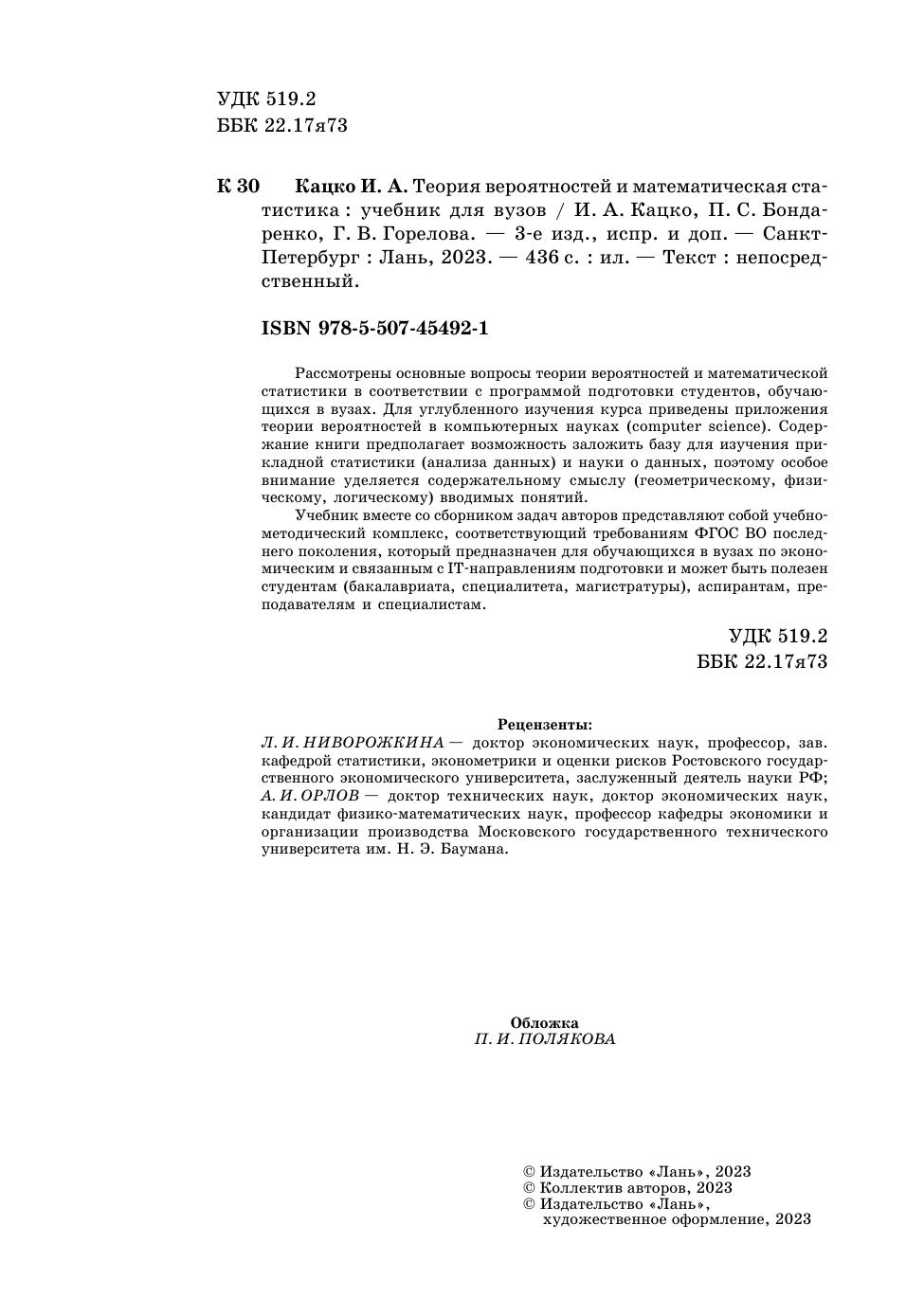 Рассмотрены основные вопросы теории вероятностей и математической статистики в соответствии с программой подготовки студентов, обучающихся в вузах. Для углубленного изучения курса приведены приложения теории вероятностей в компьютерных науках (computer science). Содержание книги предполагает возможность заложить базу для изучения прикладной статистики (анализа данных) и науки о данных, поэтому особое внимание уделяется содержательному смыслу (геометрическому, физическому, логическому) вводимых понятий. Учебник вместе со сборником задач авторов представляют собой учебно-методический комплекс, соответствующий требованиям ФГОС ВО последнего поколения, который предназначен для обучающихся в вузах по экономическим и связанным с IT-направлениям подготовки и может быть полезен студентам (бакалавриата, специалитета, магистратуры), аспирантам, преподавателям и специалистам.