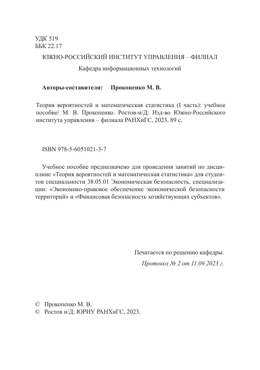 Учебное пособие предназначено для проведения занятий по дисциплине «Теория вероятностей и математическая статистика» для студентов специальности 38.05.01 Экономическая безопасность, специализации: «Экономико-правовое обеспечение экономической безопасности территорий» и «Финансовая безопасность хозяйствующих субъектов».