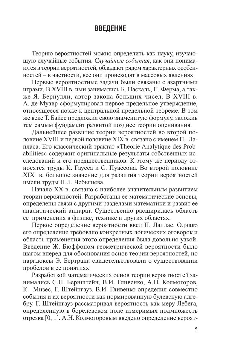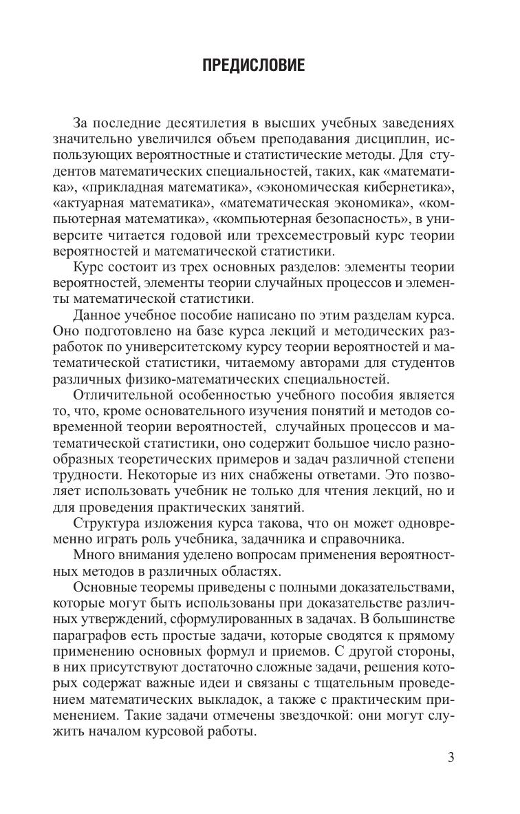 Даны определения вероятности случайных событий и основные соотношения, связанные с условными вероятностями и схемой Бернулли. Рассмотрены различные типы случайных величин, их числовые и функциональные характеристики, а также вопросы, связанные со сходимостью случайных последовательностей - закон больших чисел и центральная предельная теорема. Приведены сведения о марковских случайных процессах и цепях Маркова с дискретным и непрерывным временем, процессах с конечными моментами второго порядка, процессах с независимыми приращениями, стационарных и эргодических случайных процессах, стохастических интегралах и стохастических дифференциальных уравнениях. Рассмотрены вопросы применения случайных процессов при анализе математических моделей различных реальных объектов. Рассмотрены основные распределения, применяемые в статисти ке, методы нахождения оценок неизвестных параметров и свойства оценок, проверка простых и сложных гипотез, последовательный и дисперсионный анализ, линейные регрессионные модели. Даны решения более 130 различных типовых примеров и более 1100 задач для самостоятельного решения различной степени трудности.