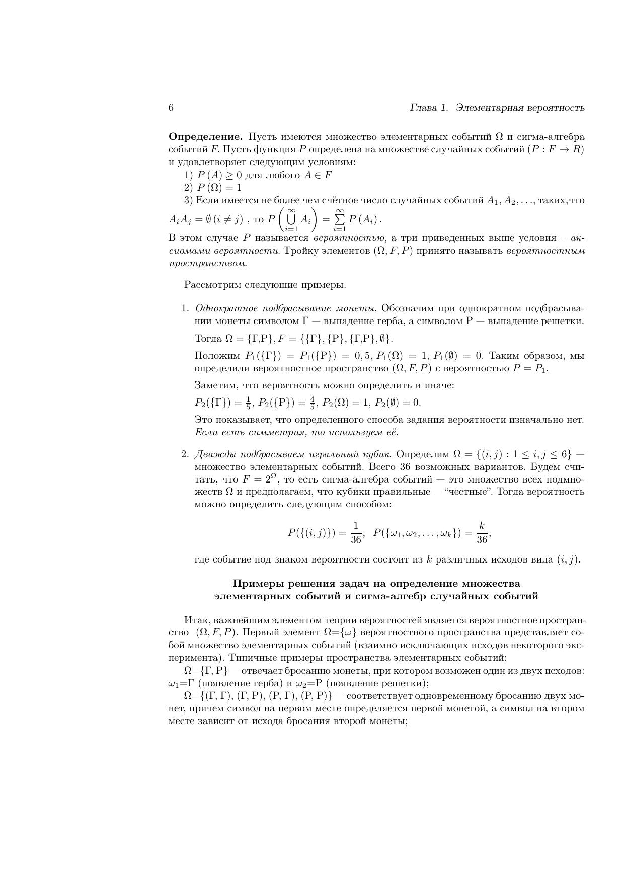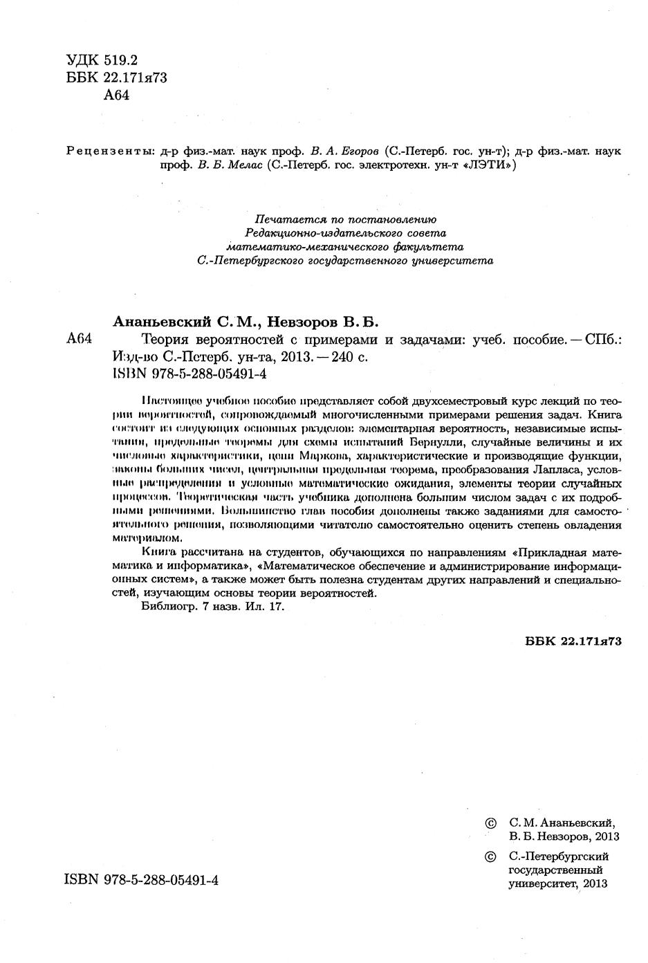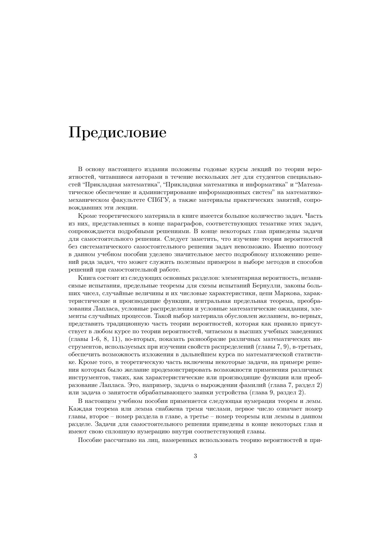Настоящее учебное пособие представляет собой двухсеместровый курс лекций по теории вероятностей, сопровождаемый многочисленными примерами решения задач. Книга состоит из следующих основных разделов: элементарная вероятность, независимые испытания, предельные теоремы для схемы испытаний Бернулли, случайные величины и их числовые характеристики, цепи Маркова, характеристические и производящие функции, законы больших чисел, центральная предельная теорема, преобразования Лапласа, условные распределения и условные математические ожидания, элементы теории случайных процессов. Теоретическая часть учебника дополнена большим числом задач с их подробными решениями. Большинство глав пособия дополнены также заданиями для самостоятельного решения, позволяющими читателю самостоятельно оценить степень овладения материалом.