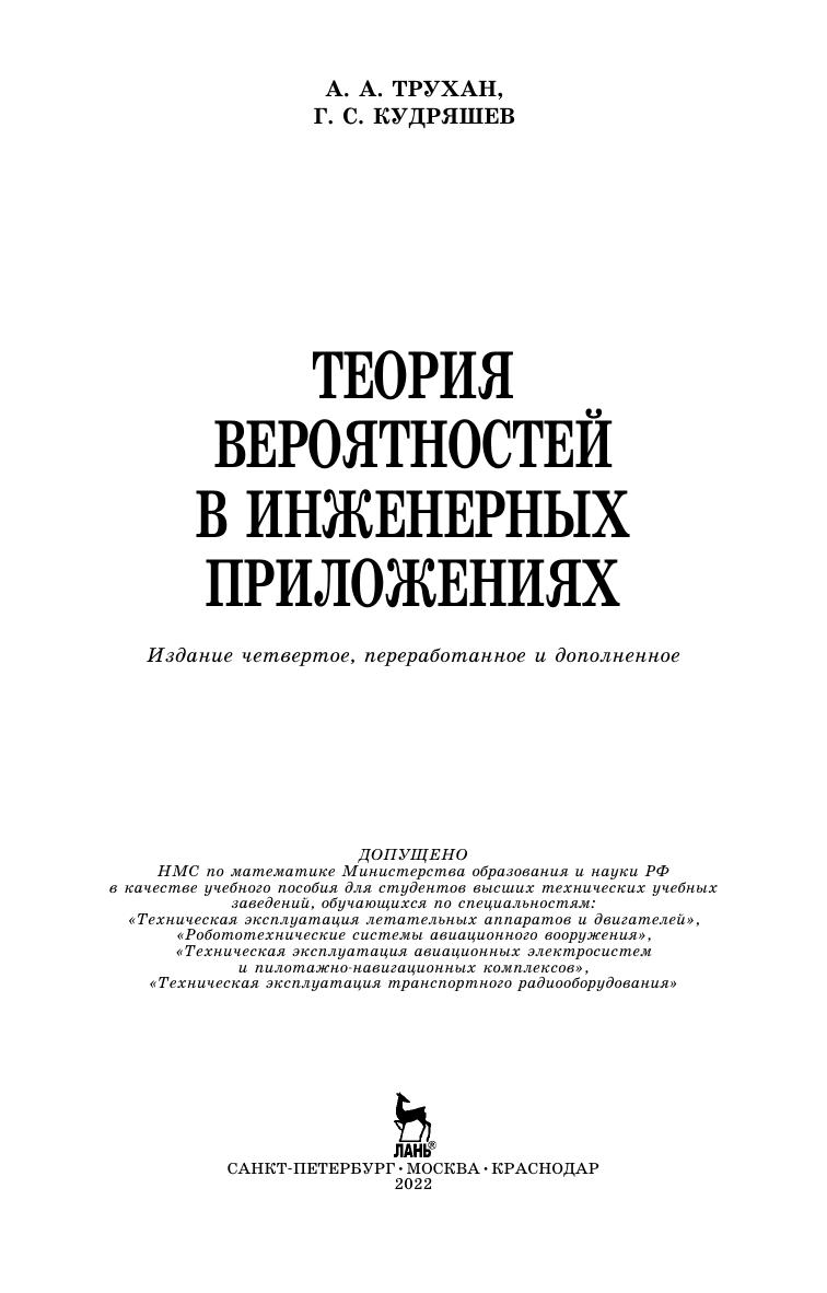 В пособии излагаются вопросы теории вероятностей и математической статистики в рамках курса высшей математики для технических вузов с общим объемом 450–510 учебных часов. Оно содержит основные положения теории вероятностей и математической статистики, а также приложения, такие как, теория информации, теория случайных процессов, теория систем массового обслуживания, теория надежности технических устройств и другие, которые являются подготовительными лекциями для успешного освоения соответствующих специальных курсов, читаемых на старших курсах. Пособие построено в виде лекций, читаемых в реальном масштабе времени, а так же практических занятий, поэтому снабжено большим количеством различных типовых задач для самостоятельной работы курсантов и студентов. Издание предназначено для студентов технических вузов и может быть использовано преподавателями математики технических вузов для подготовки к лекциям и их методической организации.