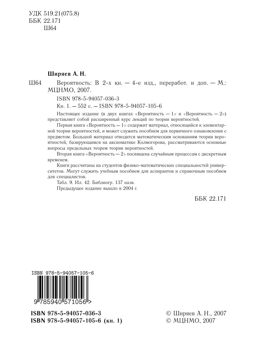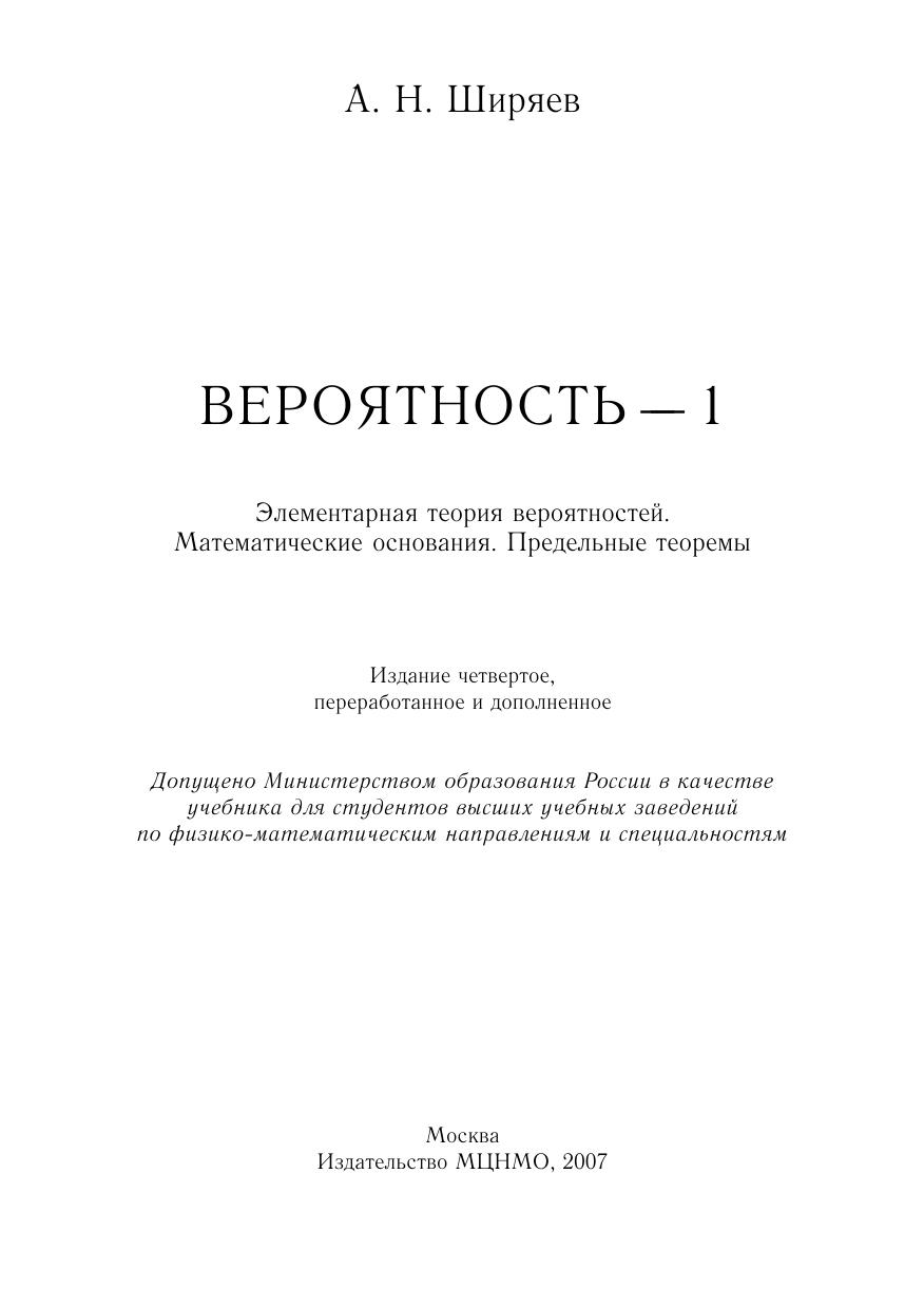 Настоящее издание (в двух книгах «Вероятность—1» и «Вероятность—2») представляет собой расширенный курс лекций по теории вероятностей.Книги рассчитаны на студентов физико-математических специальностей университетов. Могут служить учебным пособием для аспирантов и справочным пособием для специалистов.Первая книга «Вероятность—1» содержит материал, относящийся к элементарной теории вероятностей, и может служить пособием для первичного ознакомления с предметом. Большой материал отводится математическим основаниям теории вероятностей, базирующимся на аксиоматике Колмогорова, рассматриваются основные вопросы предельных теорем теории вероятностей.