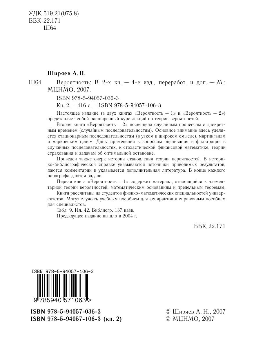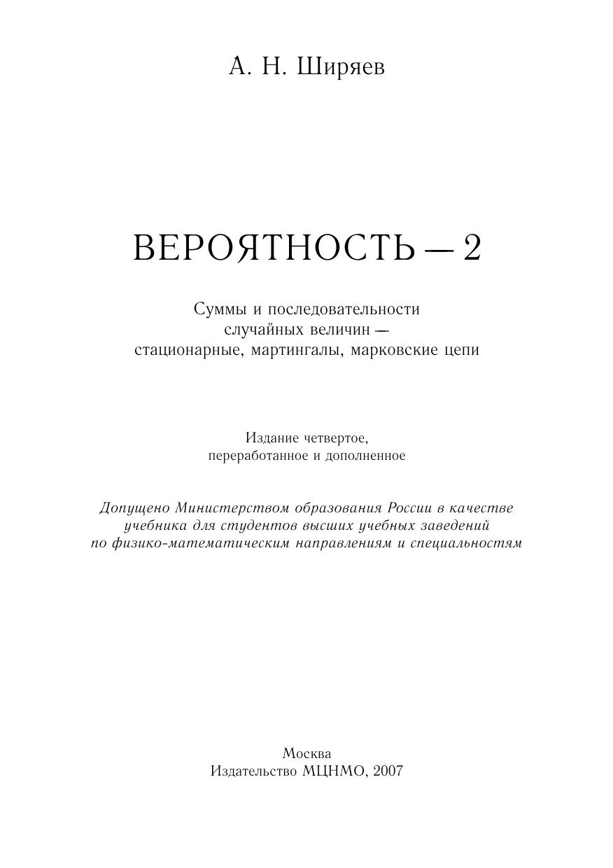 Настоящее издание (в двух книгах «Вероятность—1» и «Вероятность—2») представляет собой расширенный курс лекций по теории вероятностей.Книги рассчитаны на студентов физико-математических специальностей университетов. Могут служить учебным пособием для аспирантов и справочным пособием для специалистов.Вторая книга «Вероятность—2» посвящена случайным процессам с дискретным временем (случайным последовательностям). Основное внимание здесь уделяется стационарным последовательностям (в узком и широком смысле), мартингалам и марковским цепям. Даны применения к вопросам оценивания и фильтрации в случайных последовательностях, к стохастической финансовой математике, теории страхования и задачам об оптимальной остановке.Приведен также очерк истории становления теории вероятностей. В историко-библиографической справке указываются источники приводимых результатов, даются комментарии и указывается дополнительная литература. В конце каждого параграфа даются задачи.