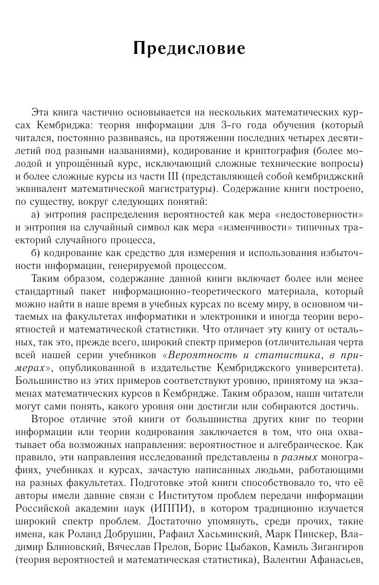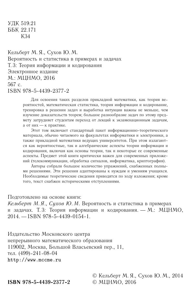 Для освоения таких разделов прикладной математики, как теория вероятностей, математическая статистика, теория информации и кодирование, тренировка в решении задач и выработка интуиции важны не меньше, чем изучение доказательств теорем; большое разнообразие задач по этому предмету затрудняет студентам переход от лекций к экзаменационным задачам, а от них — к практике. Этот том включает стандартный пакет информационно-теоретического материала, обычно читаемого на факультетах информатики и электроники, а также прикладной математики ведущих университетов. При этом излагаются как вероятностные, так и алгебраические аспекты теории информации и кодирования, включая как основы теории, так и некоторые ее современные аспекты. Предмет этой книги критически важен для современных приложений (телекоммуникации, обработка сигналов, информатика, криптография). Авторы собрали большое количество упражнений, снабженных полными решениями. Эти решения адаптированы к нуждам и умениям учащихся. Необходимые теоретические сведения приводятся по ходу изложения; кроме того, текст снабжен историческими отступлениями.