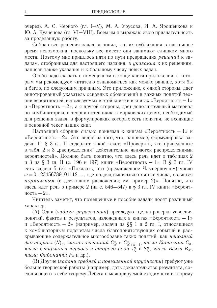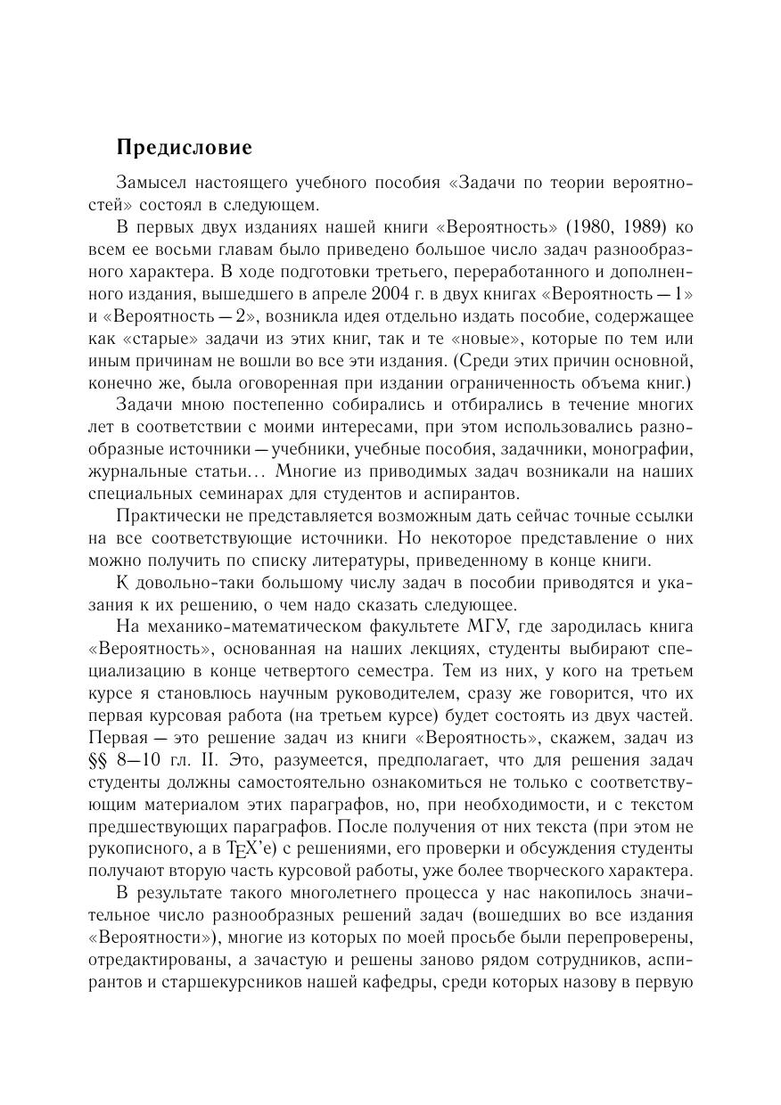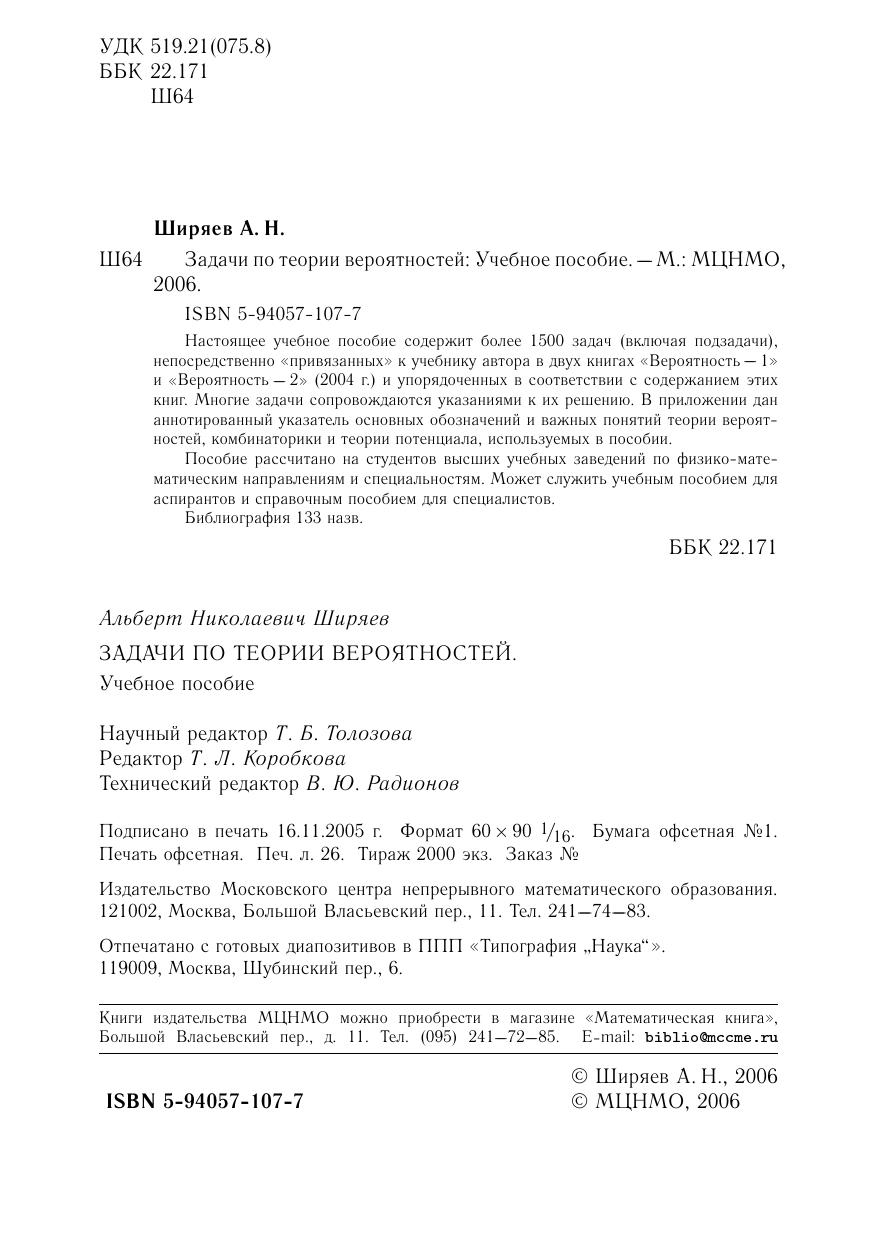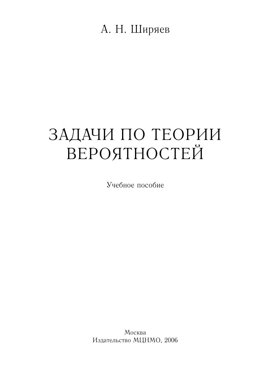 Настоящее учебное пособие содержит более 1500 задач (включая подзадачи), непосредственно «привязанных» к учебнику автора в двух книгах «Вероятность. т. 1» и «Вероятность. т. 2» (2004 г.) и упорядоченных в соответствии с содержанием этих книг. Многие задачи сопровождаются указаниями к их решению. В приложении дан аннотированный указатель основных обозначений и важных понятий теории вероятностей, комбинаторики и теории потенциала, используемых в пособии.Пособие рассчитано на студентов высших учебных заведений по физико-математическим направлениям и специальностям. Может служить учебным пособием для аспирантов и справочным пособием для специалистов.