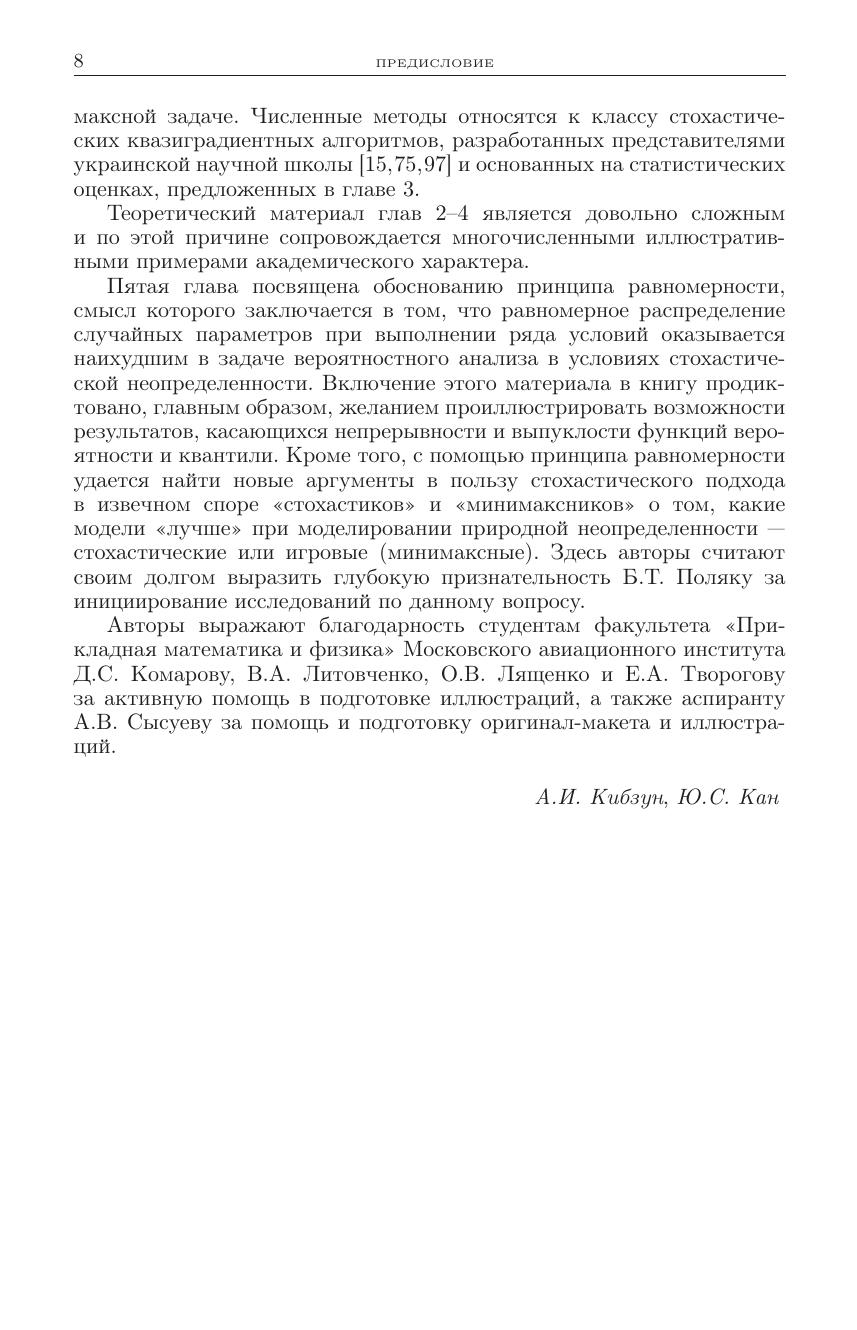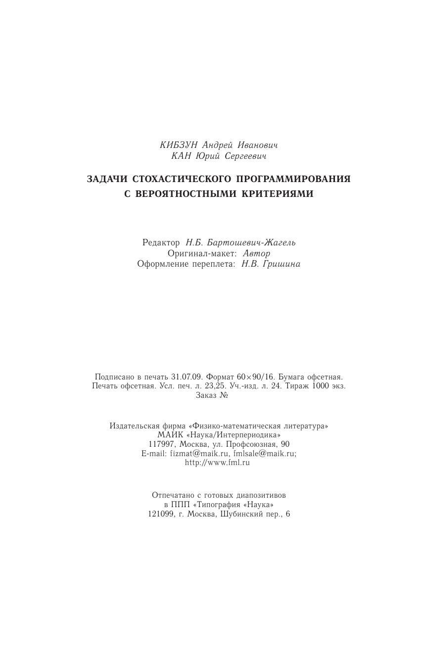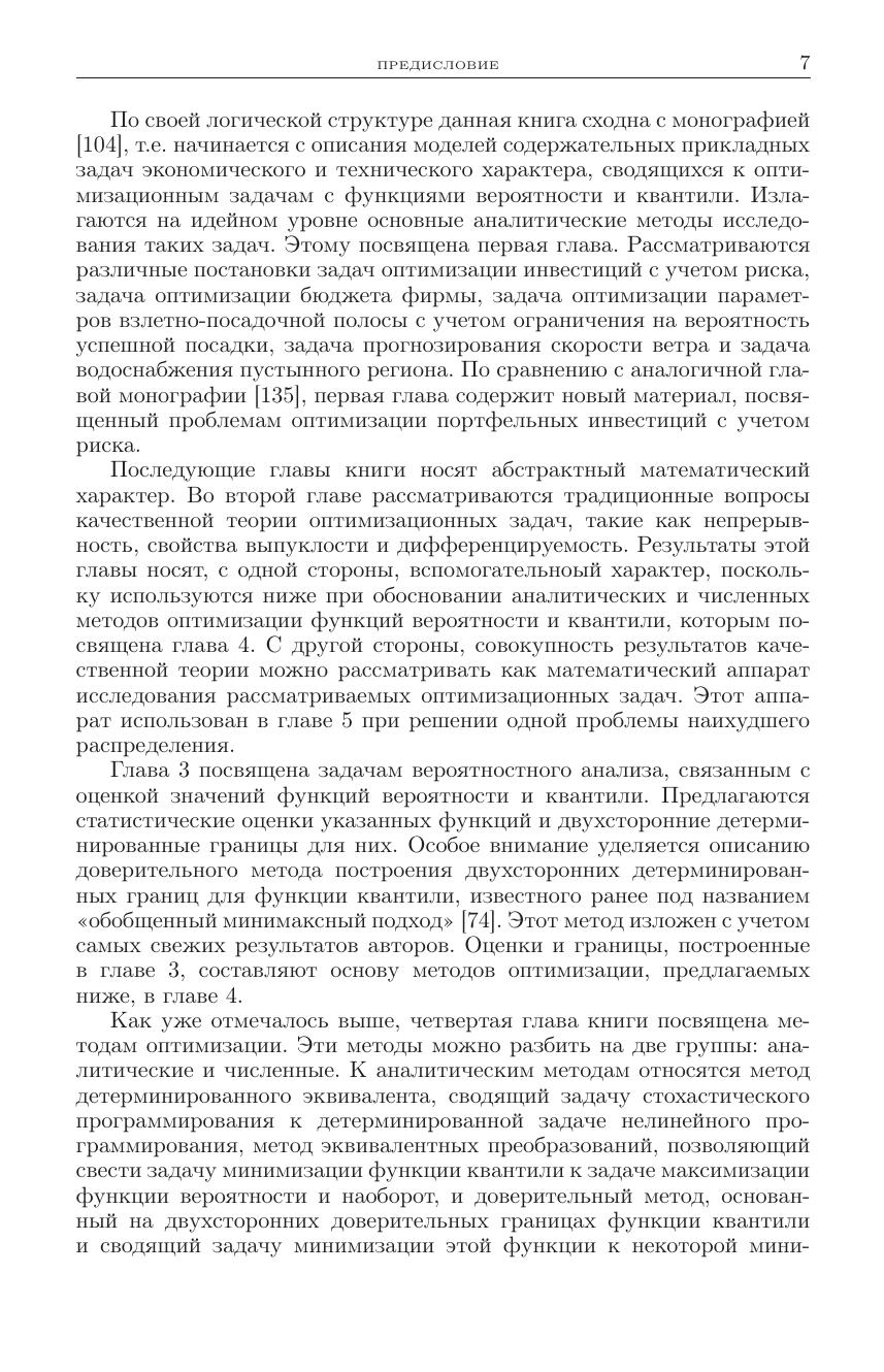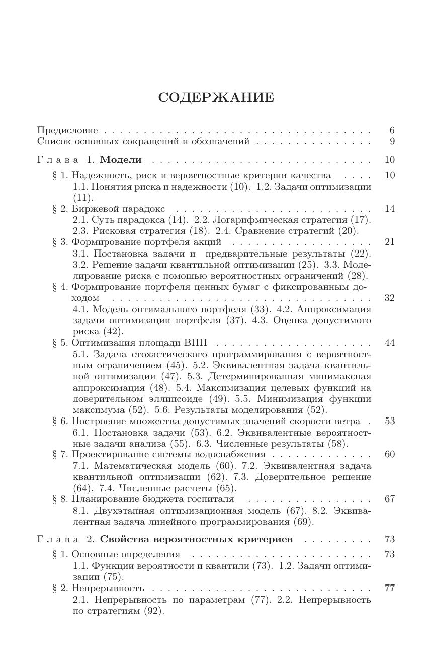 В книге освещается современное состояние раздела теории стохастических оптимизационных задач, целевыми функциями которых являются функции вероятности и квантили. В приложениях рассматриваемые постановки обычно связаны с принятием решений в условиях неопределенности с учетом риска или требований надежности. Излагаются основы качественной теории, включающей такие традиционные вопросы, как непрерывность, гладкость и свойства выпуклости критериальных функций. Приводятся статистические оценки, детерминированные границы функций вероятности и квантили, а также основанные на них аналитические методы и численные алгоритмы решения рассматриваемых задач. Теоретические положения иллюстрируются многочисленными академическими примерами и решенными прикладными задачами экономического и технического характера.