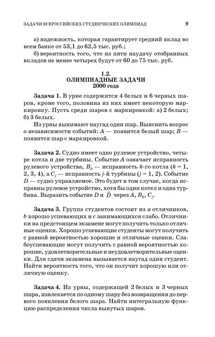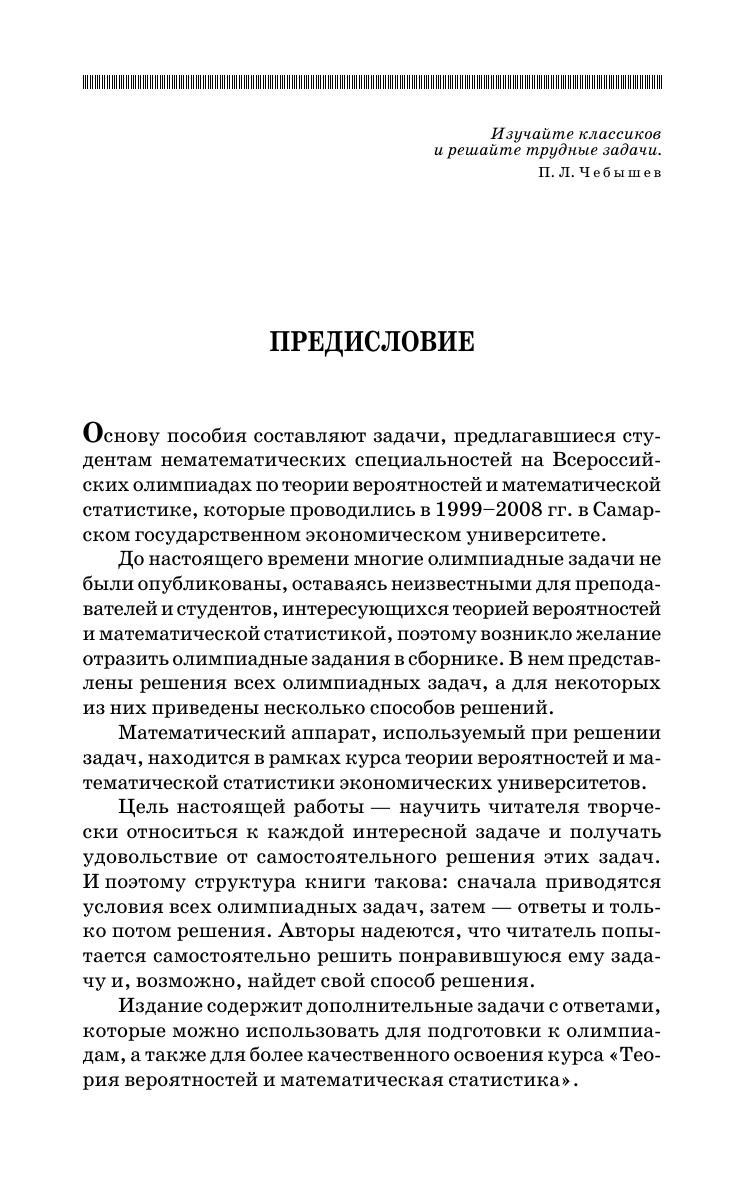 Основу книги составляют задачи, предлагавшиеся студентам экономических специальностей на Всероссийских олимпиадах по теории вероятностей и математической статистике, которые проводились в 1999–2008 гг. в Самарском государственном экономическом университете. Представлены подробные решения всех олимпиадных заданий. Издание содержит дополнительные задачи с ответами, которые можно использовать для подготовки к олимпиадам, а также для более качественного усвоения курса «Теория вероятностей и математическая статистика». Для студентов, аспирантов, преподавателей, а также всех интересующихся теорией вероятностей и математической статистикой.