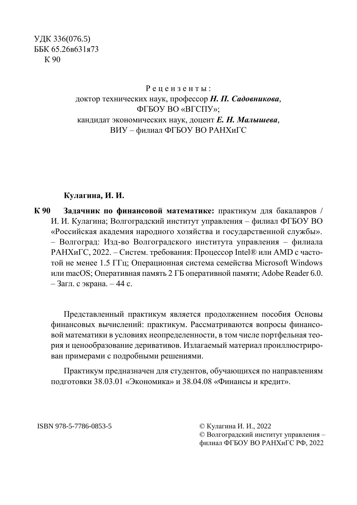 Представленный практикум является продолжением пособия Основы финансовых вычислений: практикум. Рассматриваются вопросы финансо-вой математики в условиях неопределенности, в том числе портфельная тео-рия и ценообразование деривативов. Излагаемый материал проиллюстриро-ван примерами с подробными решениями. Практикум предназначен для студентов, обучающихся по направлениям подготовки 38.03.01 «Экономика» и 38.04.08 «Финансы и кредит».