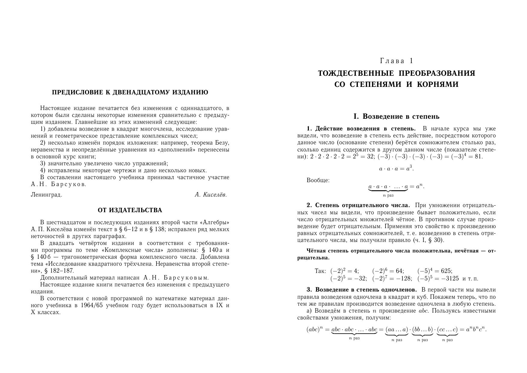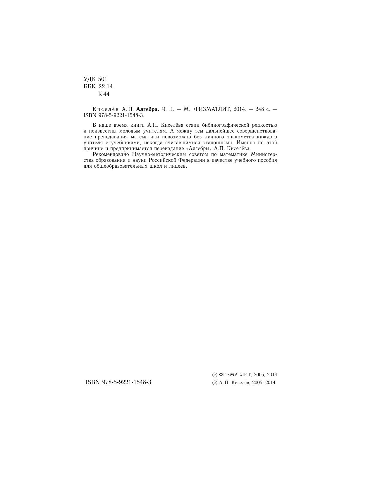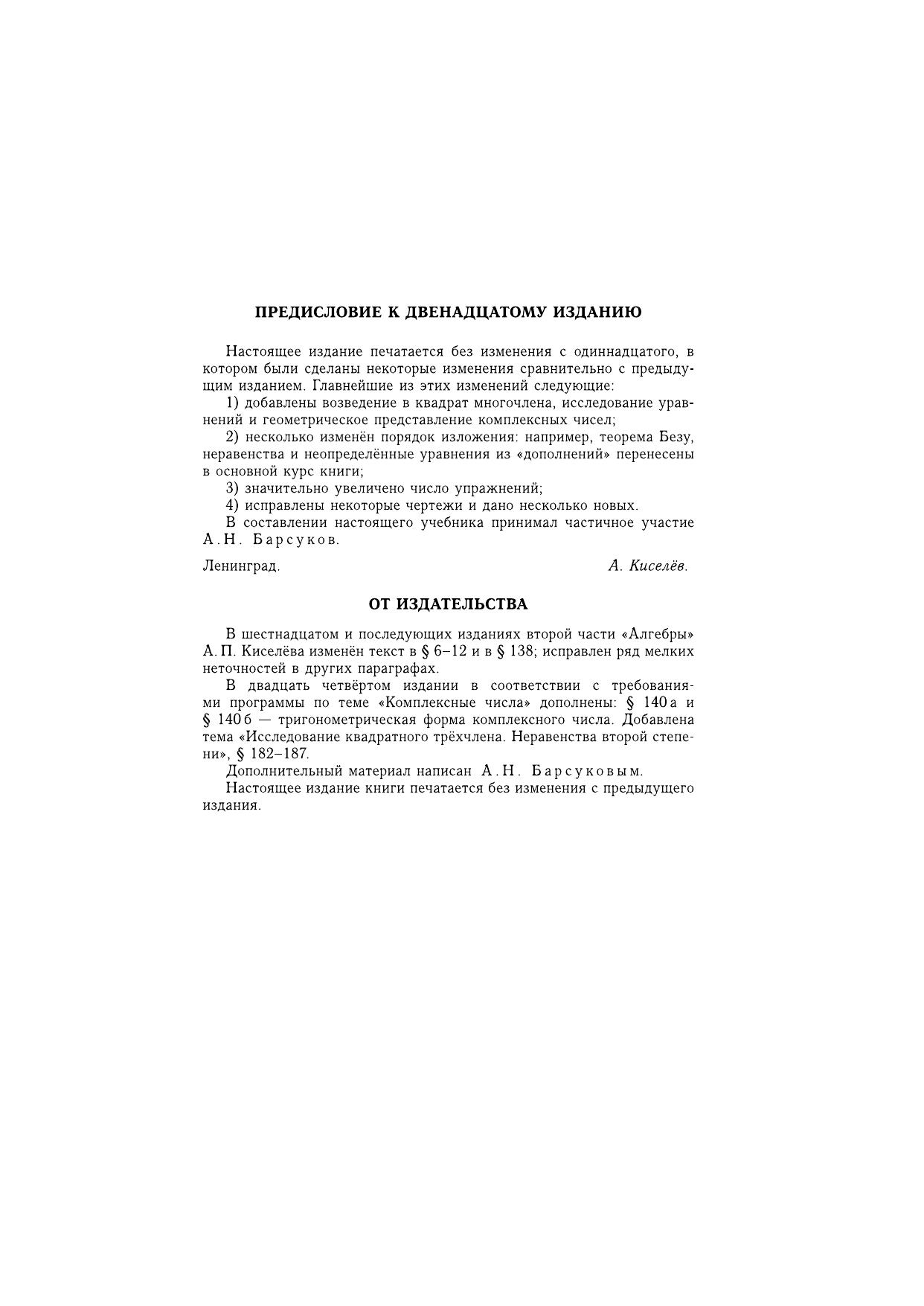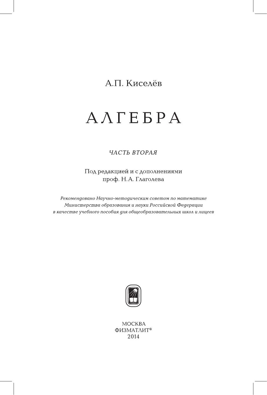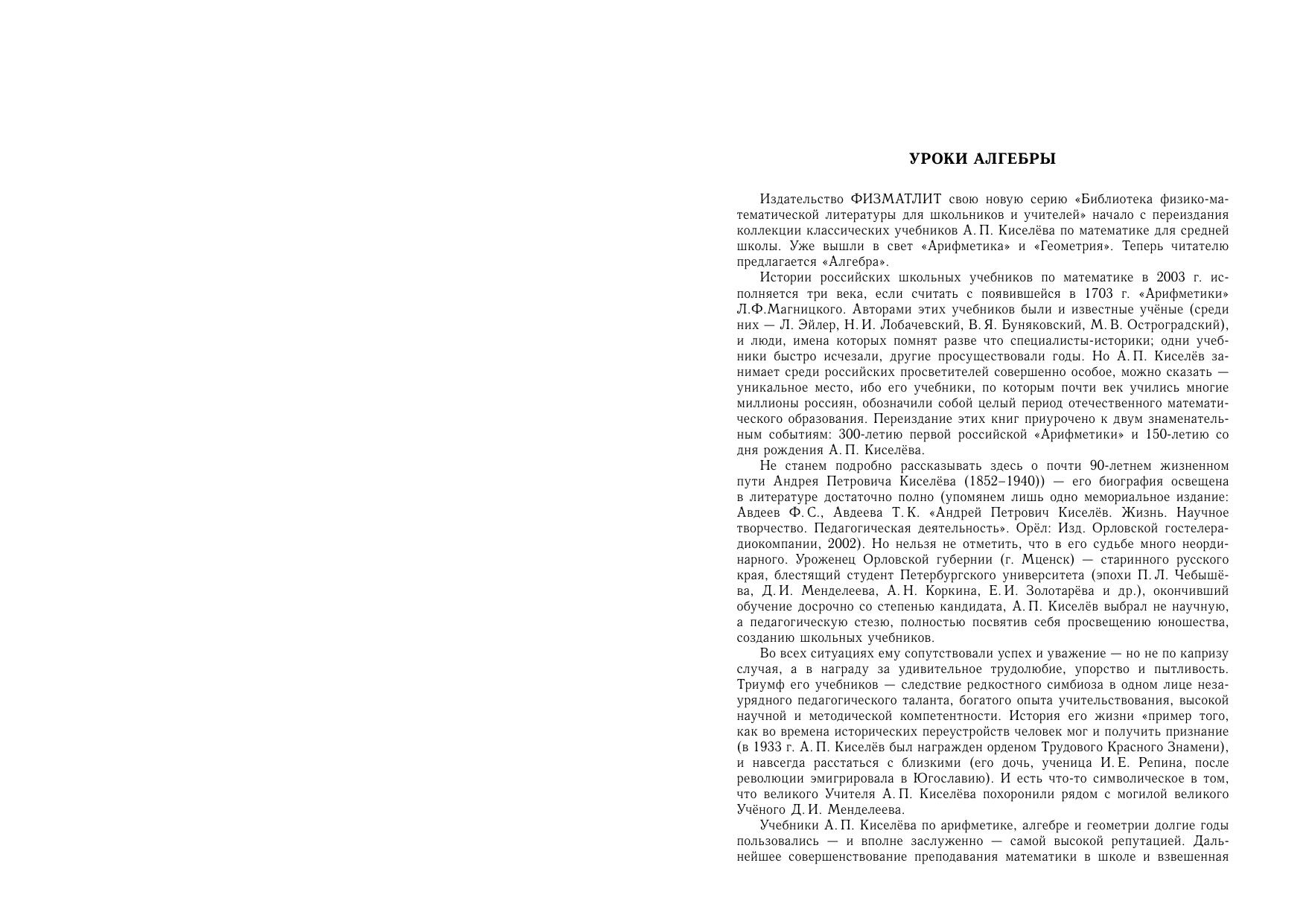 В наше время книги А.П. Киселёва стали библиографической редкостью и неизвестны молодым учителям. А между тем дальнейшее совершенствование преподавания математики невозможно без личного знакомства каждого учителя с учебниками, некогда считавшимися эталонными. Именно по этой причине и предпринимается переиздание «Алгебры» А.П. Киселёва.