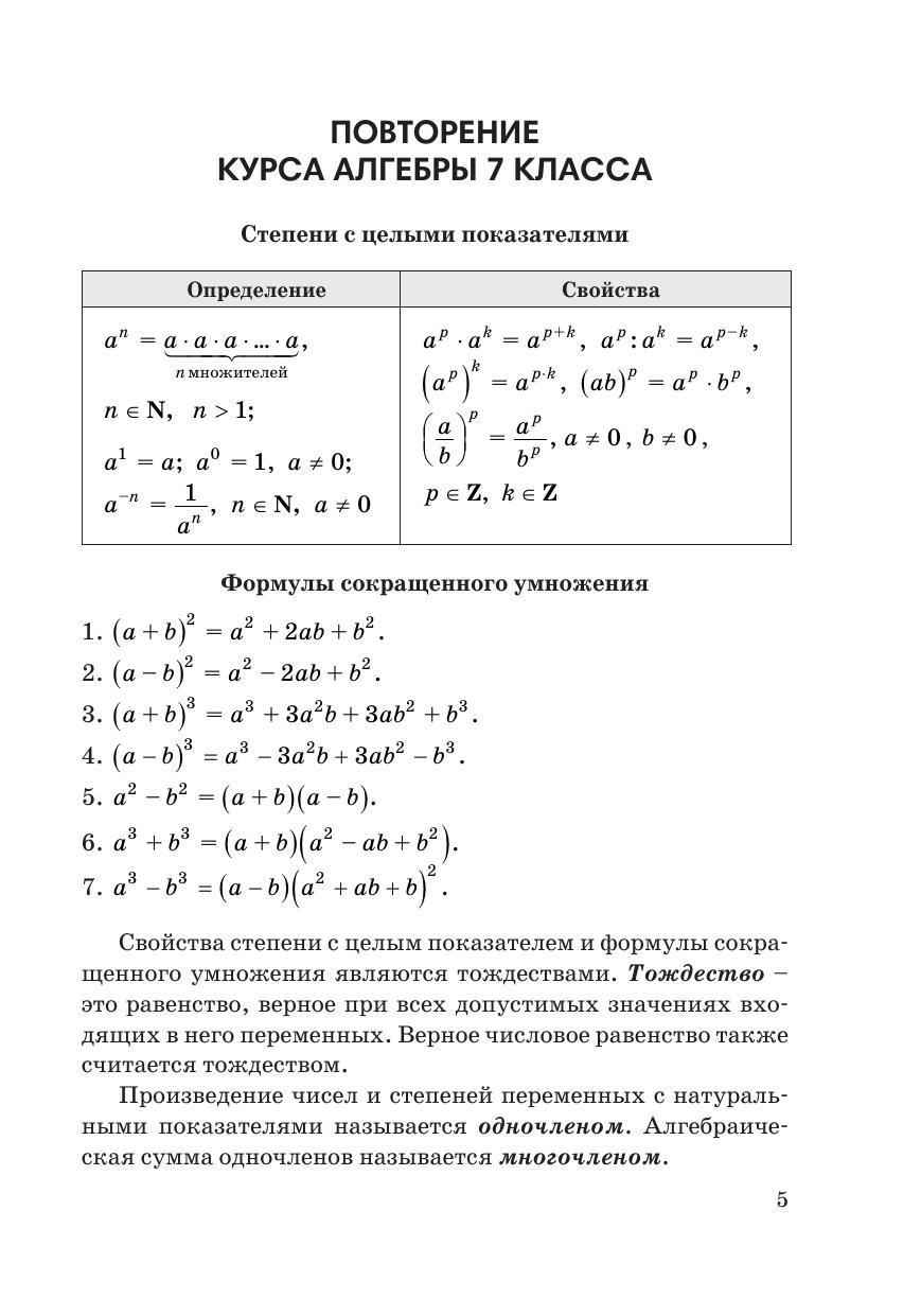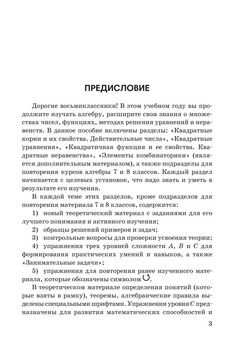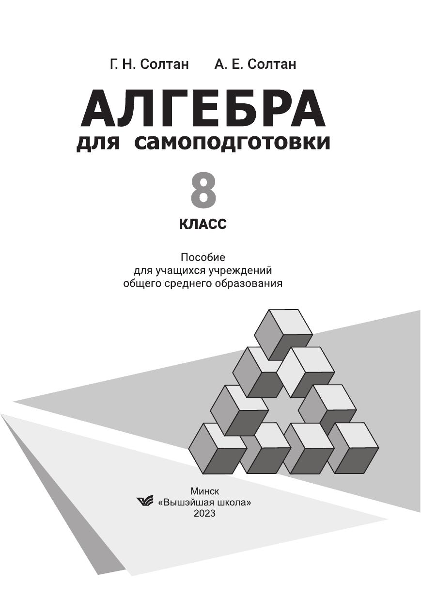 Пособие написано в соответствии с программой по математике для учреждений общего среднего образования. В нем изложен курс алгебры 8 класса в доступной, познавательной и интересной форме. Теория сопровождается примерами и задачами с решениями. К каждой теме предлагаются упражнения трех уровней сложности и занимательные задачи, в том числе олимпиадного характера, которые в дальнейшем помогут подготовиться к экзаменам и тестам, а также развить математические способности учащихся. Для учащихся учреждений общего среднего образования (школы, гимназии), абитуриентов. Будет полезно для самостоятельной работы учащихся.