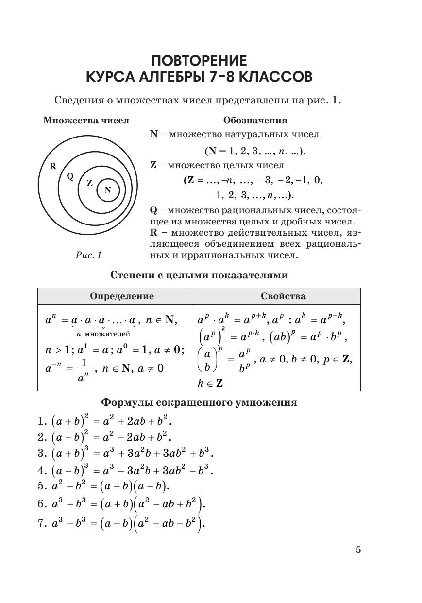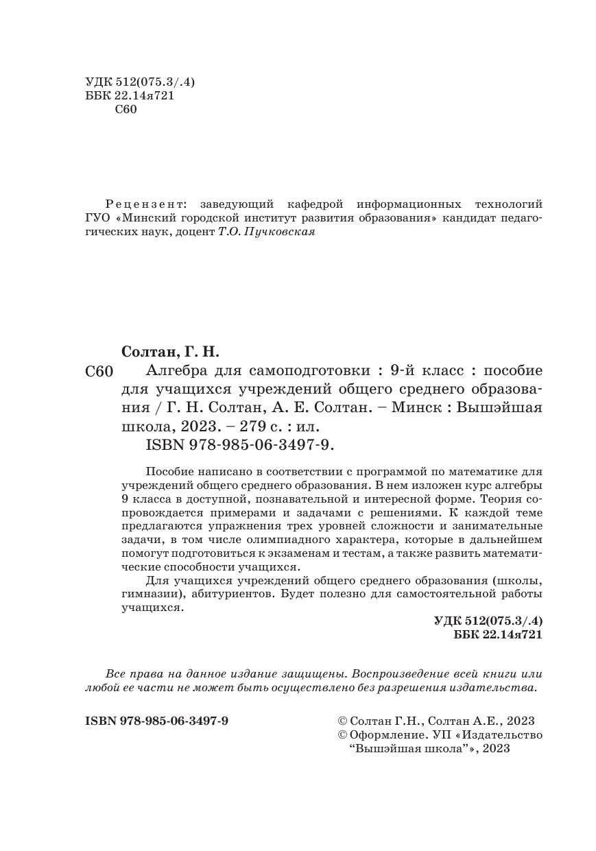 Пособие написано в соответствии с программой по математике для учреждений общего среднего образования. В нем изложен курс алгебры 9 класса в доступной, познавательной и интересной форме. Теория сопровождается примерами и задачами с решениями. К каждой теме предлагаются упражнения трех уровней сложности и занимательные задачи, в том числе олимпиадного характера, которые в дальнейшем помогут подготовиться к экзаменам и тестам, а также развить математические способности учащихся. Для учащихся учреждений общего среднего образования (школы, гимназии), абитуриентов. Будет полезно для самостоятельной работы учащихся.