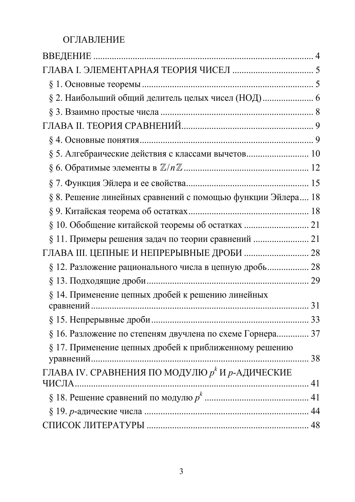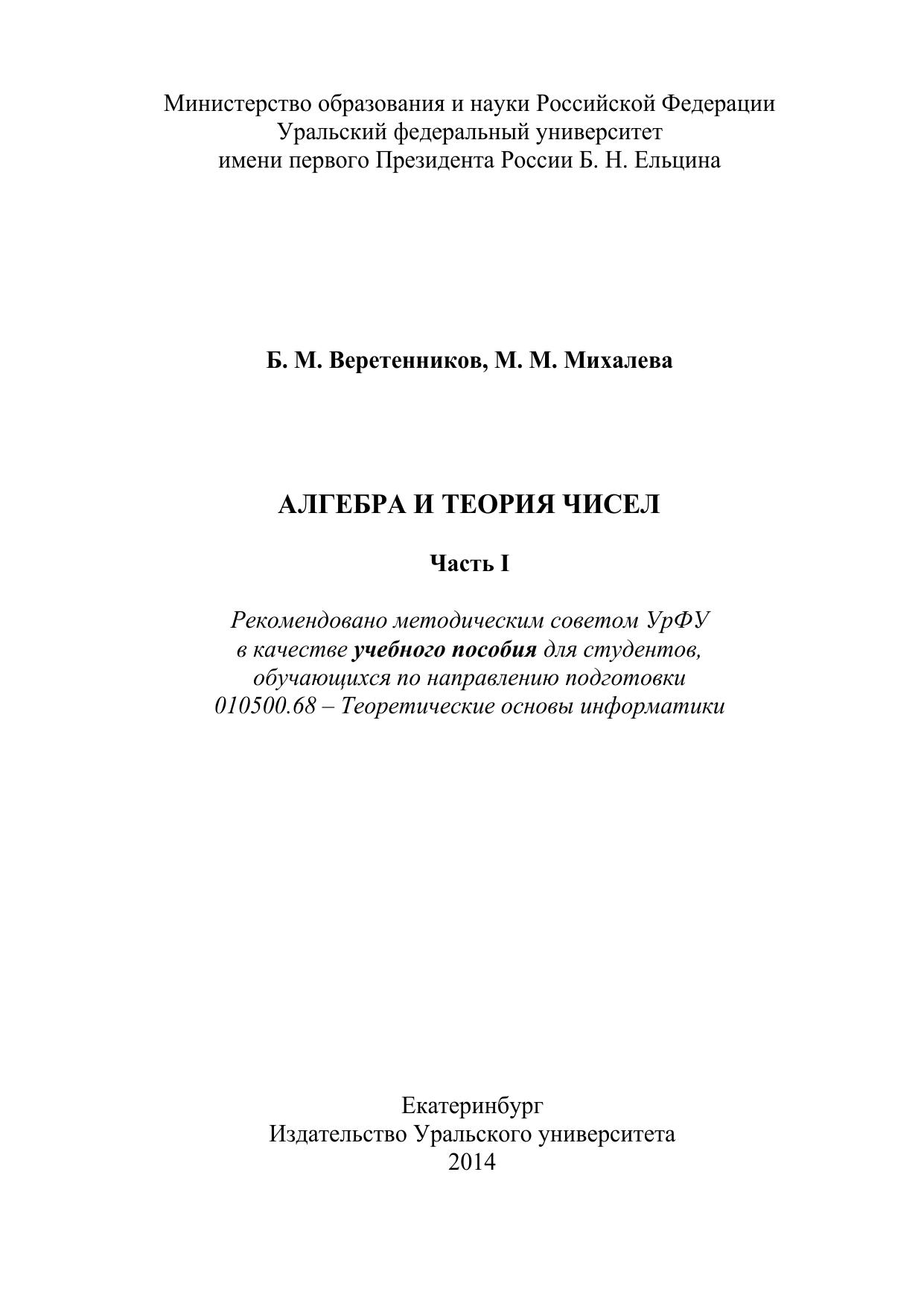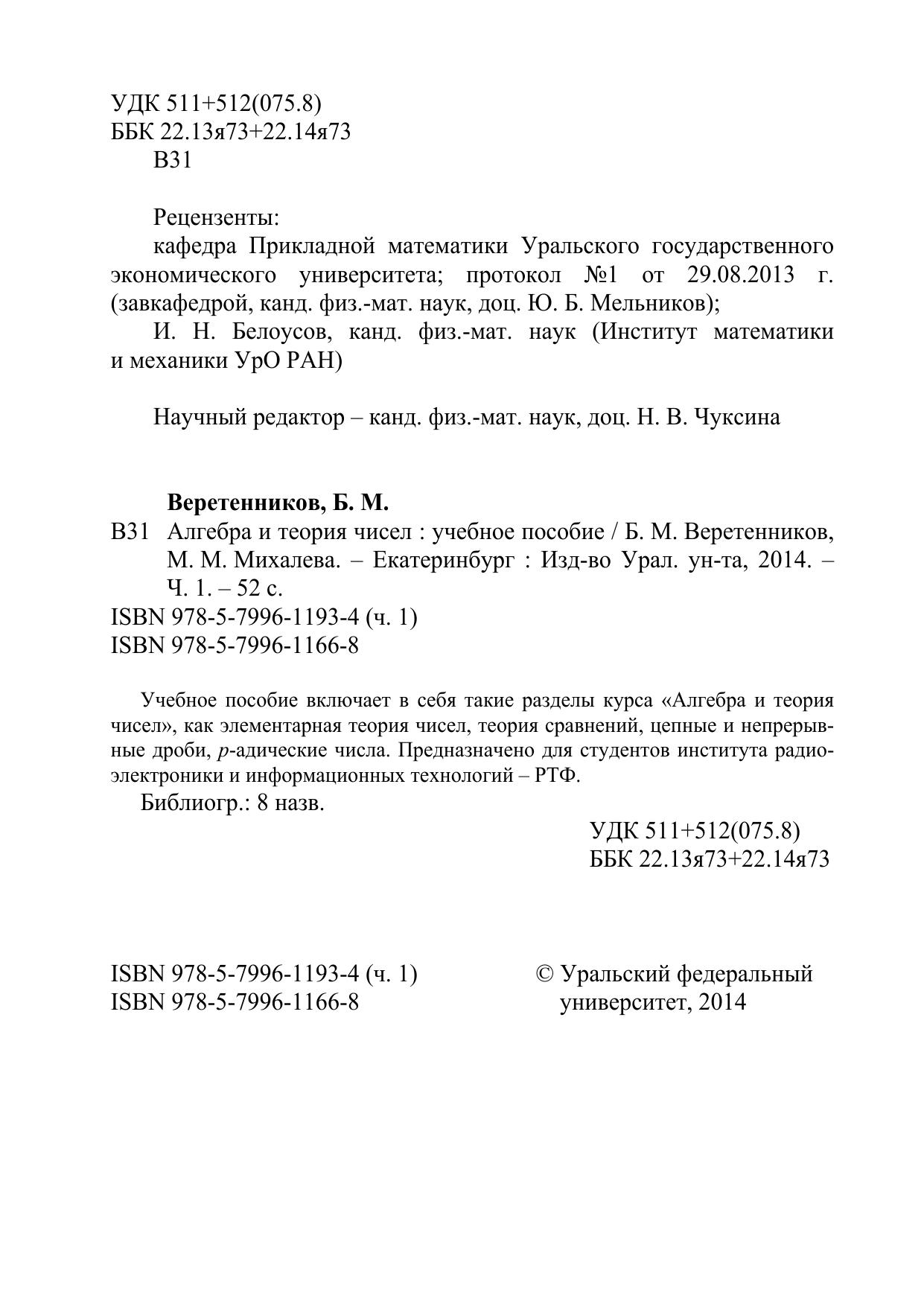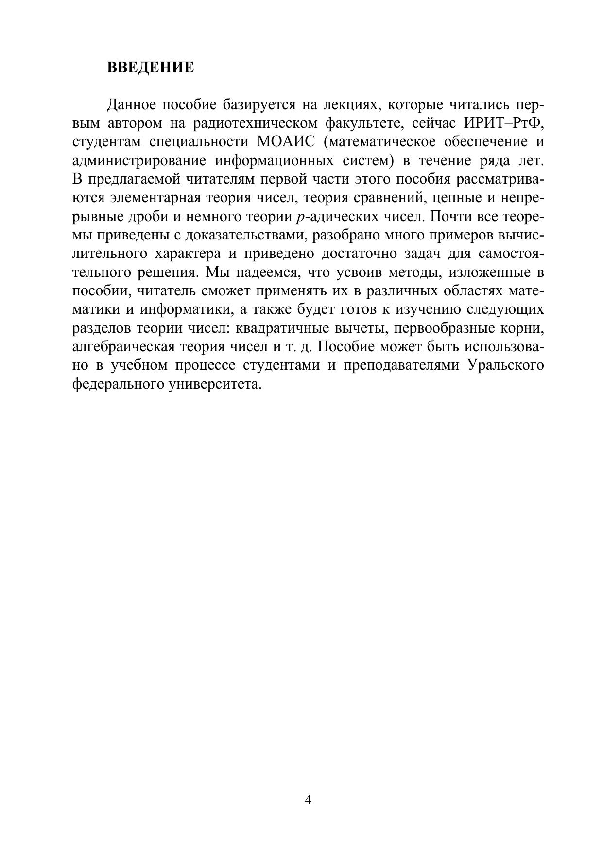 Учебное пособие включает в себя такие разделы курса «Алгебра и теория чисел», как элементарная теория чисел, теория сравнений, цепные и непрерывные дроби, p-адические числа. Предназначено для студентов института радиоэлектроники и информационных технологий – РТФ.