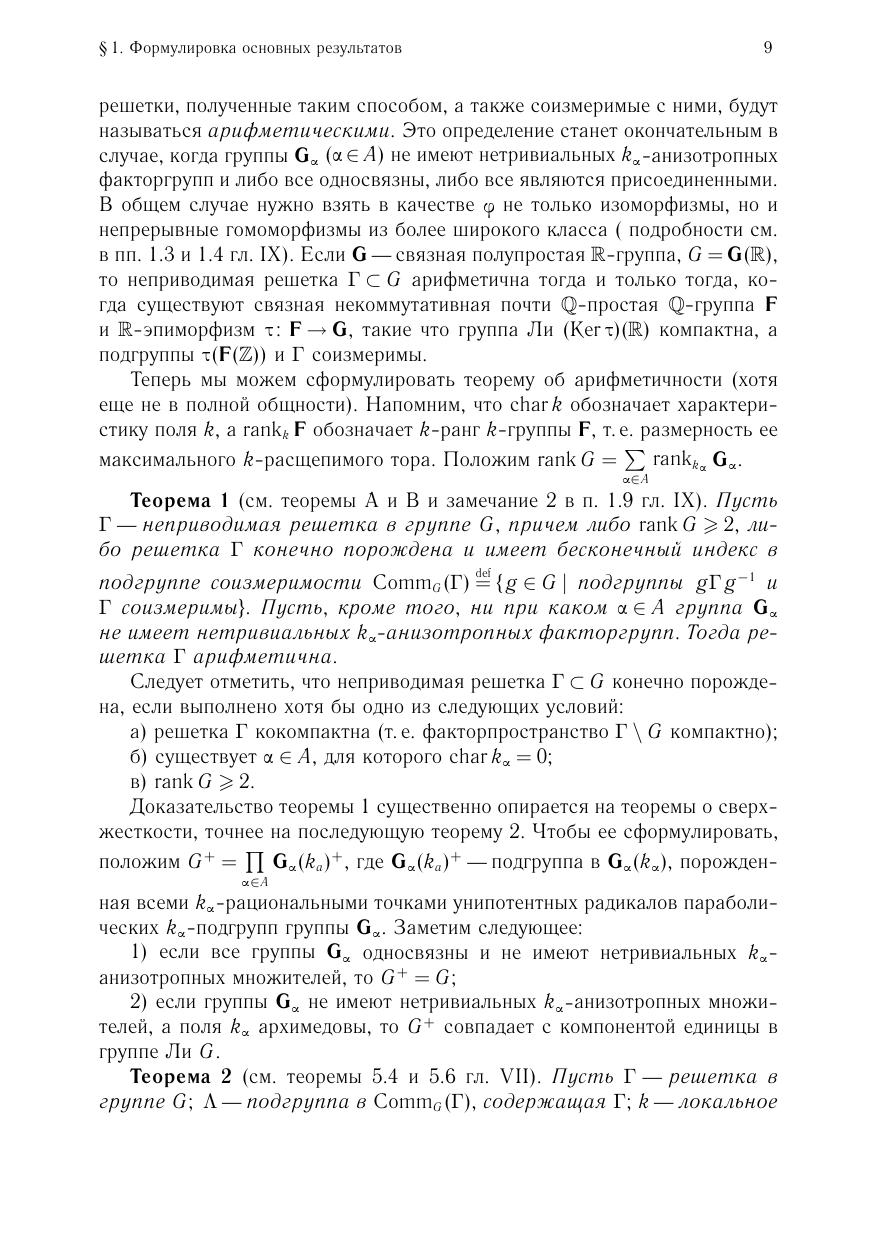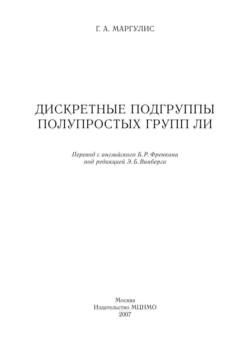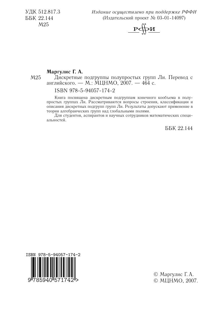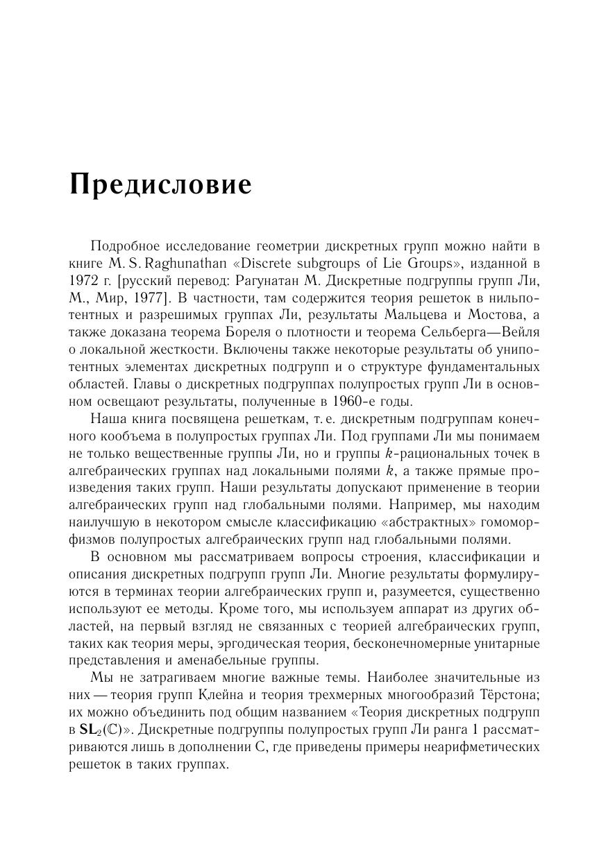 Книга посвящена дискретным подгруппам конечного кообъема в полупростых группах Ли. Рассматриваются вопросы строения, классификации и описания дискретных подгрупп групп Ли. Результаты допускают применение в теории алгебраических групп над глобальными полями.Для студентов, аспирантов и научных сотрудников математических специальностей.